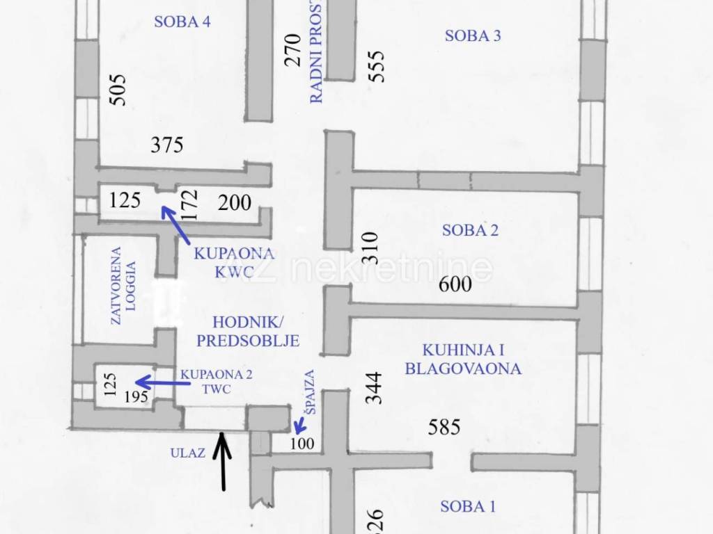 The apartment is located on the fourth floor and consists of an entrance hall, two bathrooms, four bedrooms, pantry, loggia, kitchen with dining room, work area, and storage in the attic part of the building that extends above the apartment.