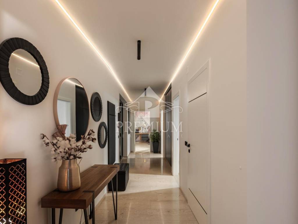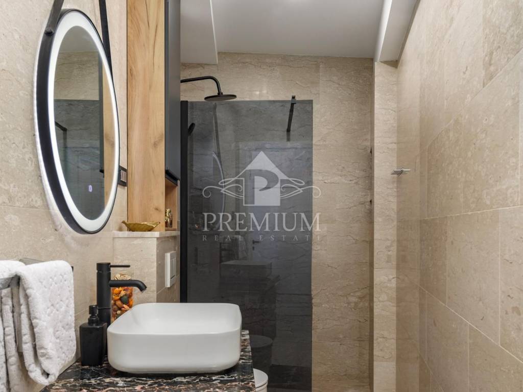The 230 m2 apartment is clad in first-class Italian Royal stone for floor and wall coverings, while Nero Portoro stone is used for the kitchen countertops and bathrooms.