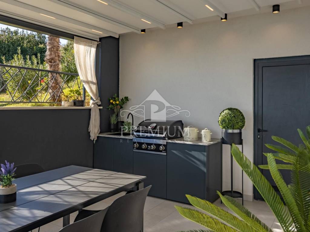 The dining room and living room have direct access to the terrace, where there is an outdoor table and a summer kitchen with a barbecue.