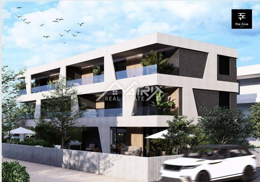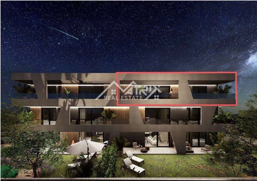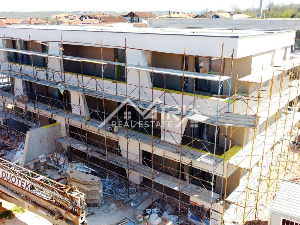 A modern apartment is for sale in a newly built building near Umag. The apartment has a net usable area of 82.9 m2 and is located on the second floor of a building with a total of six residential units. It consists of a spacious living room with a kitchen, two bedrooms, a bathroom, a WC, a large 27 m2 terrace, and a storage room in the basement. The apartment comes with one parking space, with the option to purchase an additional parking space.