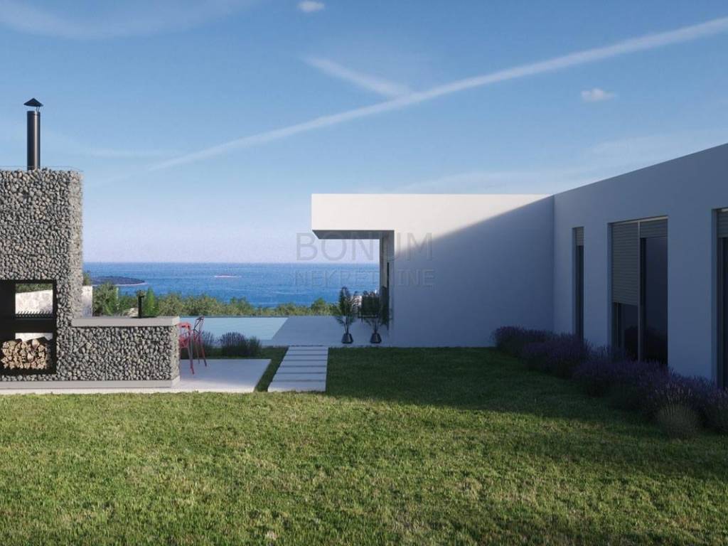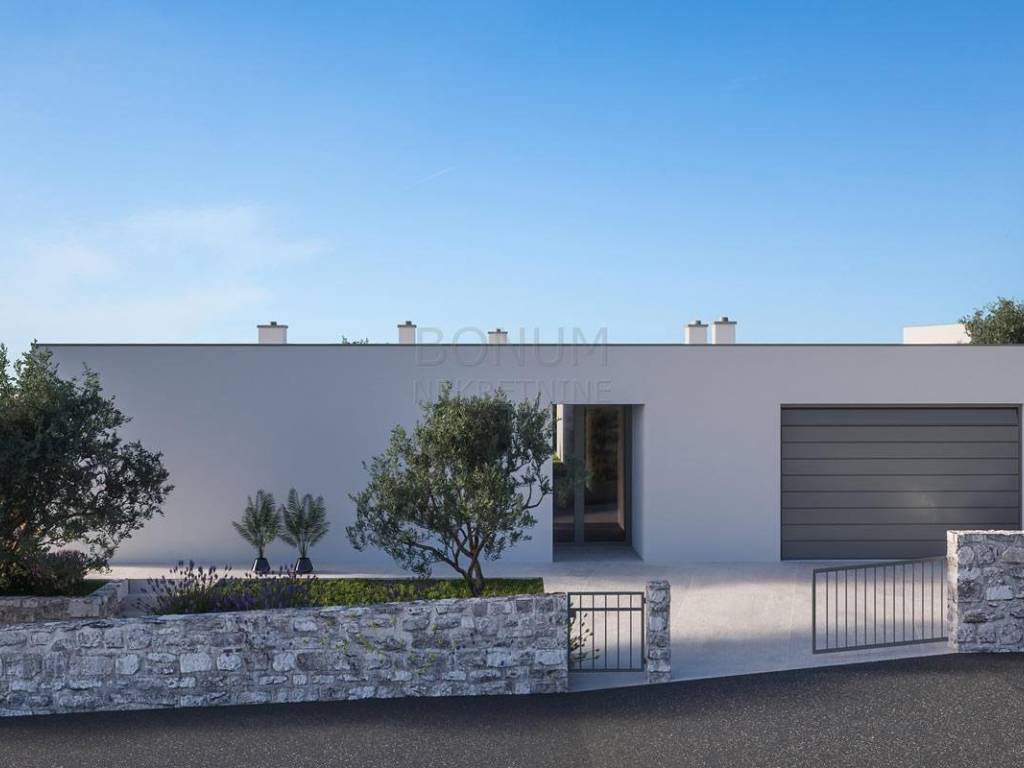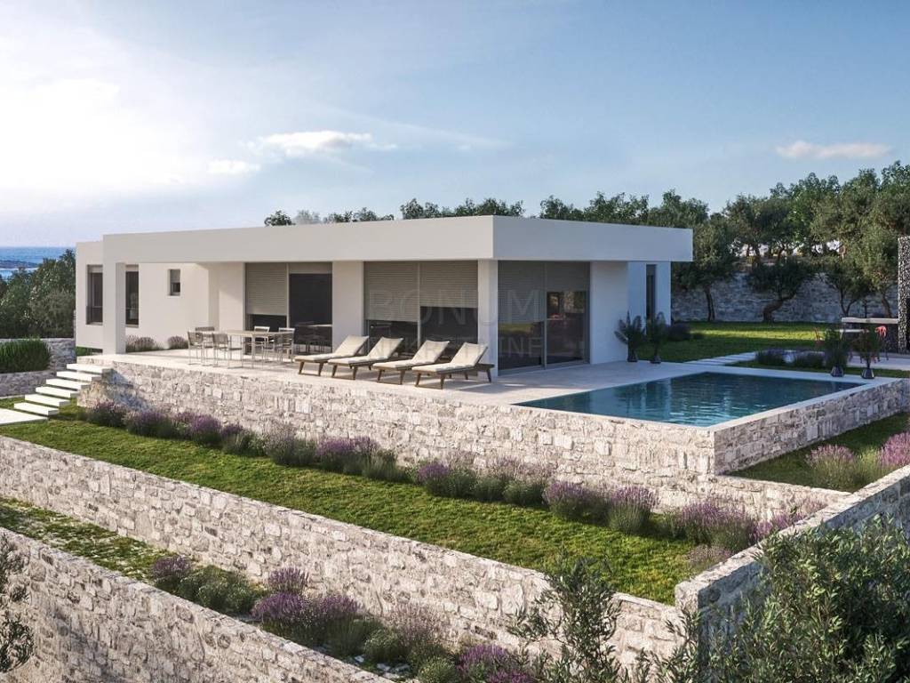 A beautiful modern villa for sale in the hinterland of Primosten. It is located in a complex of seven similar villas. An interesting feature of these villas is that they are positioned so that each has an open view of the sea and the surrounding archipelago. This property consists of a basement and a ground floor. In the basement there is a garage for two cars and two storage rooms. An internal staircase leads to the ground floor. The ground floor consists of an entrance hall, four bedrooms (each has its own bathroom), laundry, fitness room, toilet and a large living room with kitchen and dining area in one part. From the living room there is an exit to the pool and sun deck. The planned move into the villa is in 2022. The villa will be built on a plot of approximately 2128 m2 and the garden itself will be decorated in Mediterranean style. The proximity of the center of Primosten (2.5 km) and easy access from any part of Europe or the world give this property added value. An ideal property to escape from busy and stressful cities.