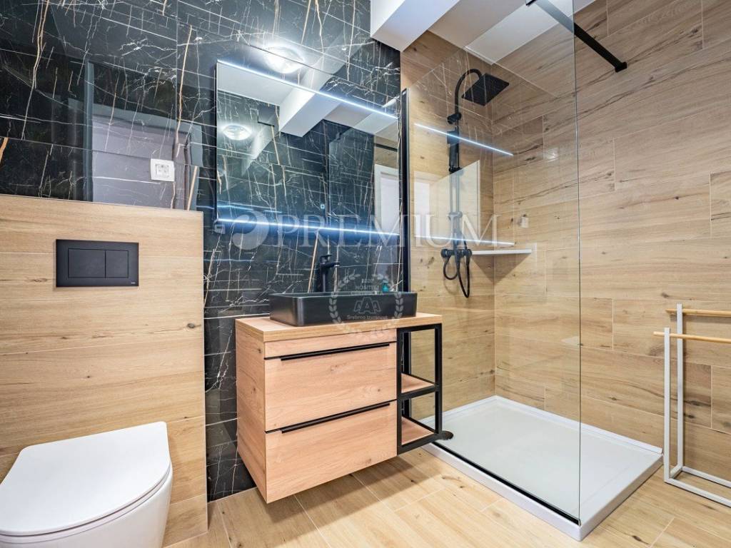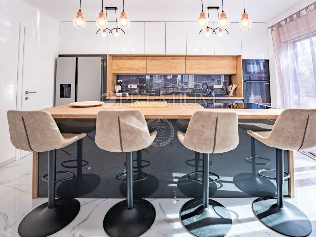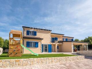 On the ground floor there is an entrance area, a bedroom with a bathroom, a toilet, a laundry room, a wardrobe, an open space kitchen with a dining room and a living room, with access to a covered terrace and garden, where there is a heated swimming pool (32 m2), sun deck, barbecue, children's playground.