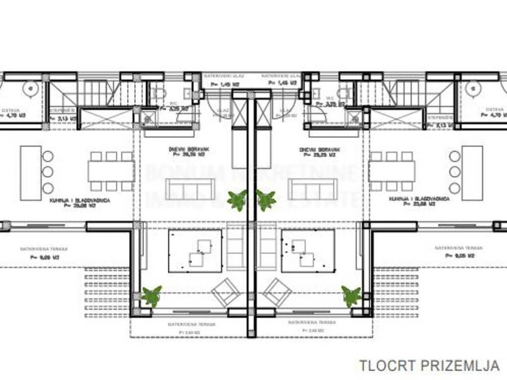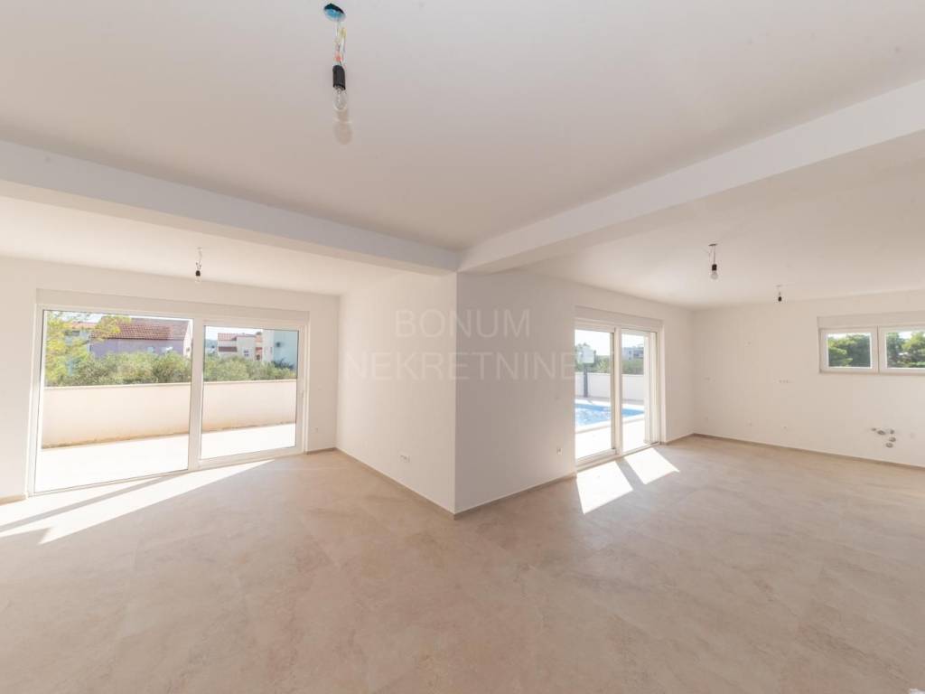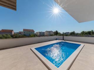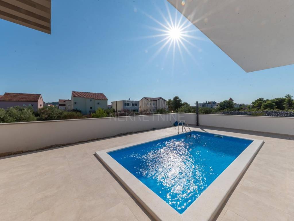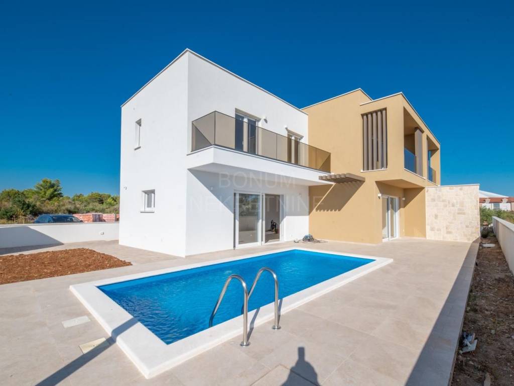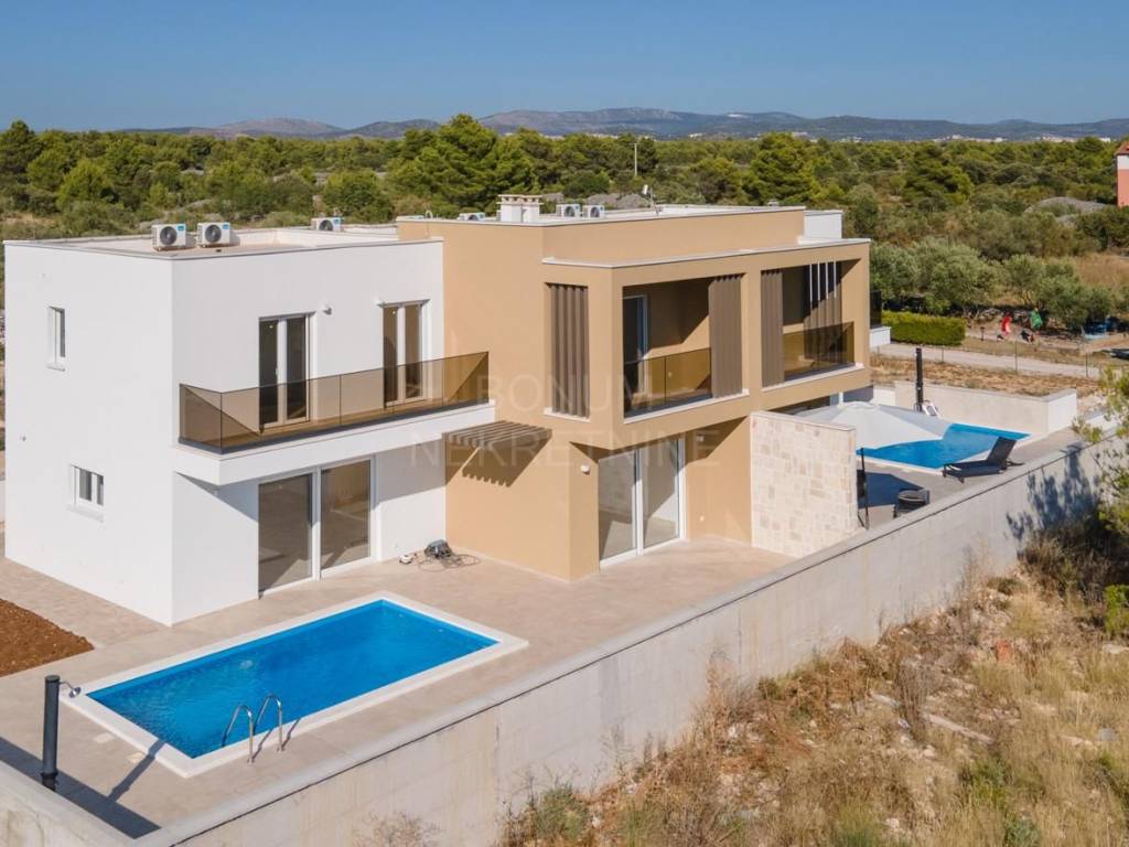 Semi-detached house with pool for sale in Srima, Vodice. The house is located in a quiet location, near the beach (250 m). It consists of ground and first floor. He has a great schedule. The ground floor has a storage room, toilet and living room with kitchen and dining area in one unit. From the living room and kitchen there are exits to the covered terraces in front of which is a sun deck with a swimming pool and a landscaped garden. An internal staircase leads to the first floor. Upstairs are three bedrooms, one of which has its own wardrobe and bathroom and terrace. The other two bedrooms share a second bathroom and have a shared balcony. The planned move-in is in the spring of 2023. Quality materials are used in the construction and the house will be well equipped (electric shutters with mosquito nets, security doors, underfloor heating in bathrooms and toilets, air conditioning in all rooms ..) The house has its own parking. Excellent property, ideal for staying throughout the calendar year but also for tourist rental.