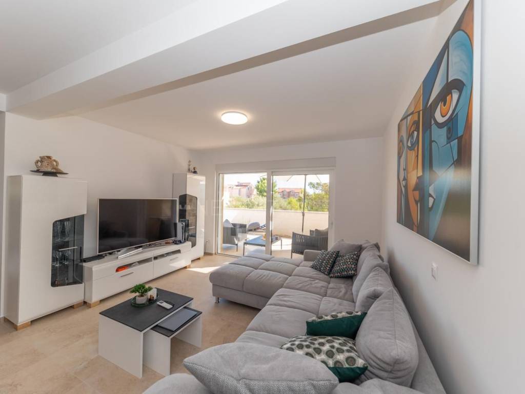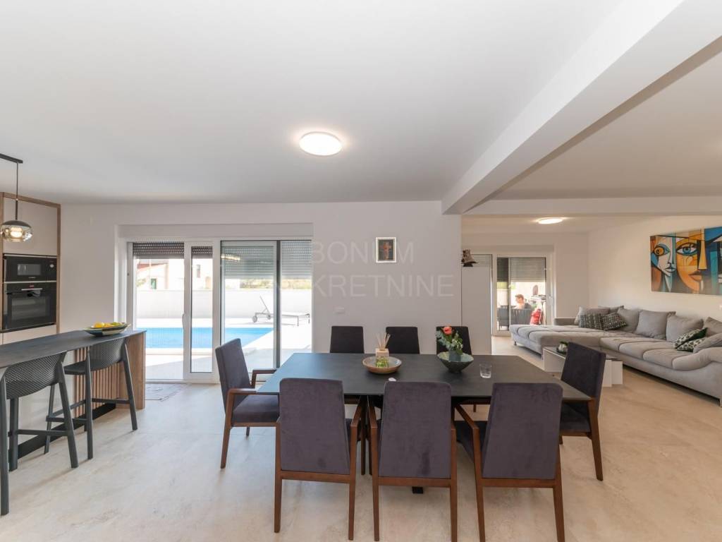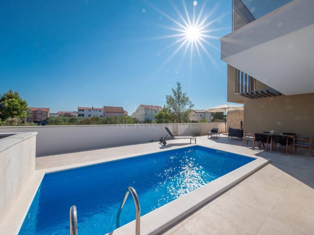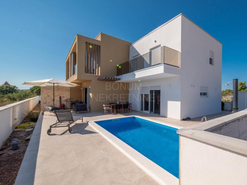 Semi-detached house with pool for sale in Srima, Vodice. The house is located in a quiet location, near the beach (250 m). It consists of ground and first floor. He has a great schedule. The ground floor has a storage room, toilet and living room with kitchen and dining area in one unit. From the living room and kitchen there are exits to the covered terraces in front of which is a sun deck with a swimming pool and a landscaped garden. An internal staircase leads to the first floor. Upstairs are three bedrooms, one of which has its own wardrobe and bathroom and terrace. The other two bedrooms share a second bathroom and have a shared balcony. The planned move-in is in the spring of 2023. Quality materials are used in the construction and the house will be well equipped (electric shutters with mosquito nets, security doors, underfloor heating in bathrooms and toilets, air conditioning in all rooms ..) The house has its own parking. Excellent property, ideal for staying throughout the calendar year but also for tourist rental.