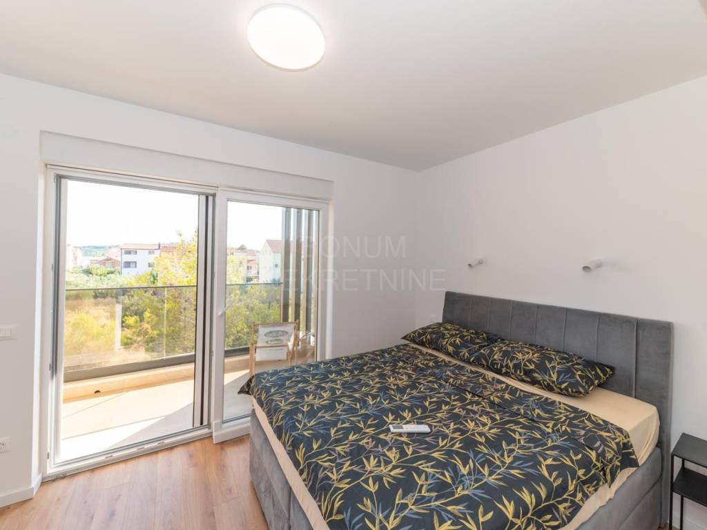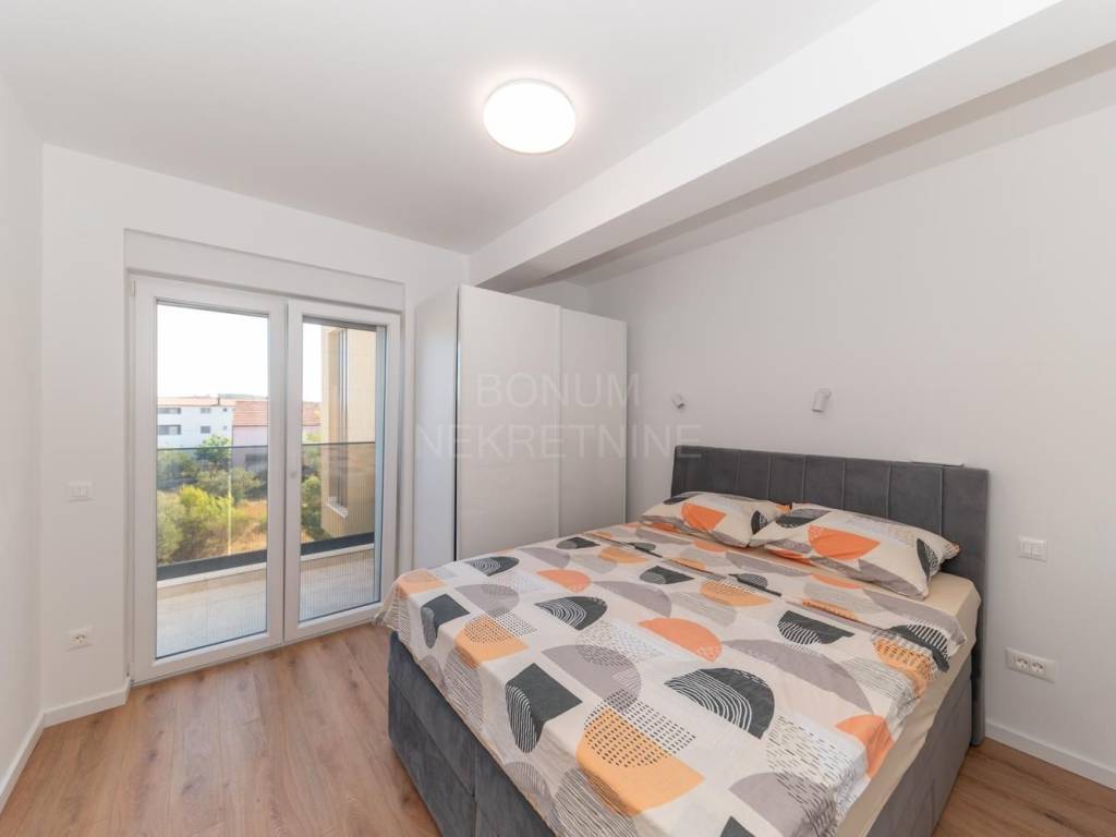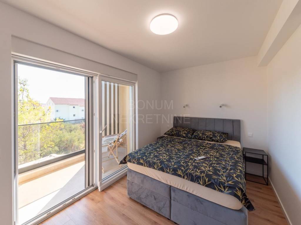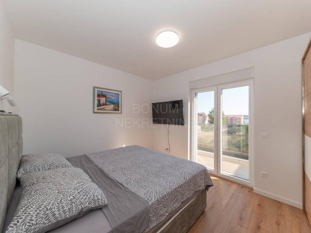 Semi-detached house with pool for sale in Srima, Vodice. The house is located in a quiet location, near the beach (250 m). It consists of ground and first floor. He has a great schedule. The ground floor has a storage room, toilet and living room with kitchen and dining area in one unit. From the living room and kitchen there are exits to the covered terraces in front of which is a sun deck with a swimming pool and a landscaped garden. An internal staircase leads to the first floor. Upstairs are three bedrooms, one of which has its own wardrobe and bathroom and terrace. The other two bedrooms share a second bathroom and have a shared balcony. The planned move-in is in the spring of 2023. Quality materials are used in the construction and the house will be well equipped (electric shutters with mosquito nets, security doors, underfloor heating in bathrooms and toilets, air conditioning in all rooms ..) The house has its own parking. Excellent property, ideal for staying throughout the calendar year but also for tourist rental.