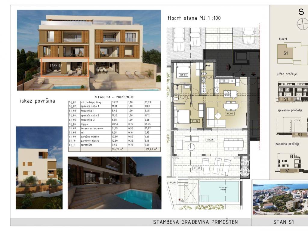 The apartment (S1) is located on the ground floor of the building and consists of a living room with kitchen and dining room in one unit, two bedrooms, two bathrooms, a loggia of 28.59 m2, then a large terrace connected to a swimming pool of 51.75 m2 and a garden of 9.28 m2. The apartment also has an outdoor parking space, then one garage space and storage in the basement of the building.