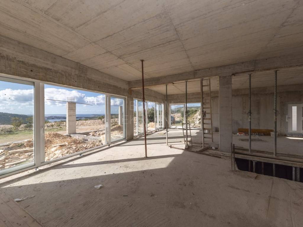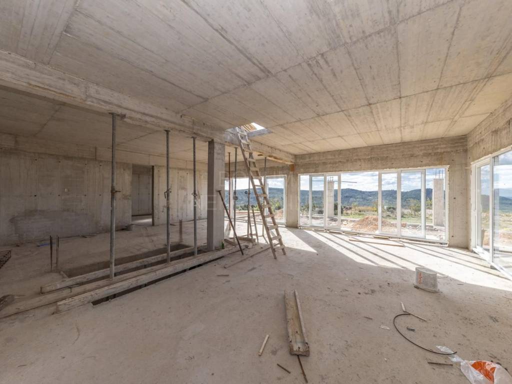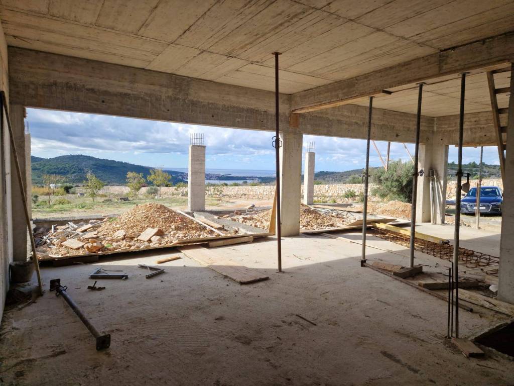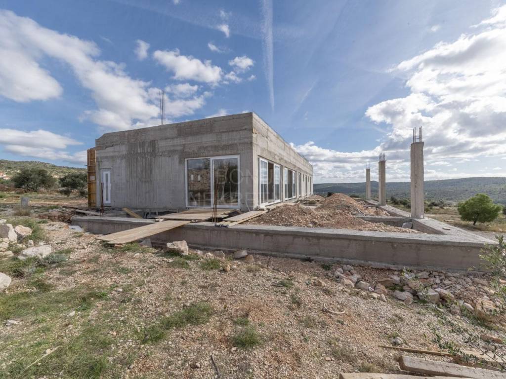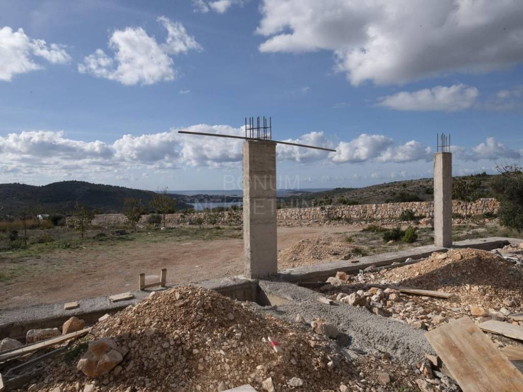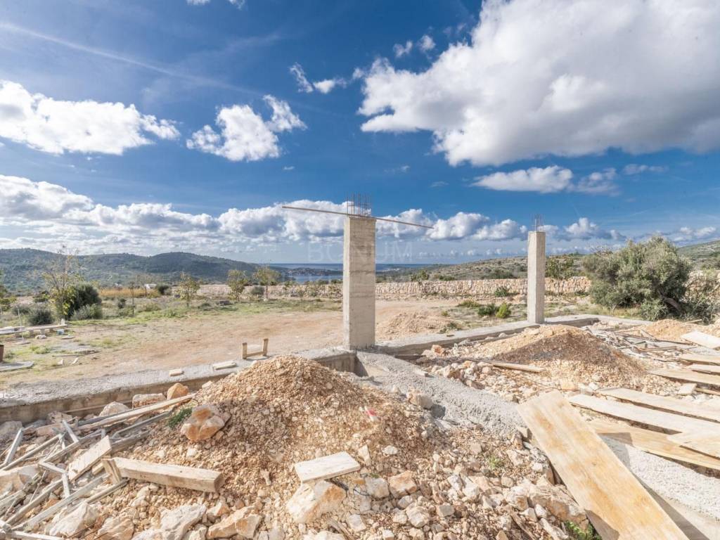 An extremely interesting house under construction with a beautiful view of the sea is for sale, Rogoznica. It is located in a quiet area, on a spacious plot of 20,000 m2. The planned property is being built for the purpose of a family farm. It consists of a basement and a ground floor and has a gross construction area of 355.85 m2. In the basement there are storage rooms for oil and wine, while on the ground floor there is a planned household in the family farm (wine and oil tasting room, two sanitary facilities, a room for serving ready-made food, a staff room and six bedrooms with bathrooms. The basement and ground floor are connected with a semicircular staircase.The rest of the area is conceived as land planted with permanent agricultural plantations in at least 70% of the area (olives, immortelles and aromatic plants). An excellent location for all those who love peace and enjoyment of the Mediterranean way of life.