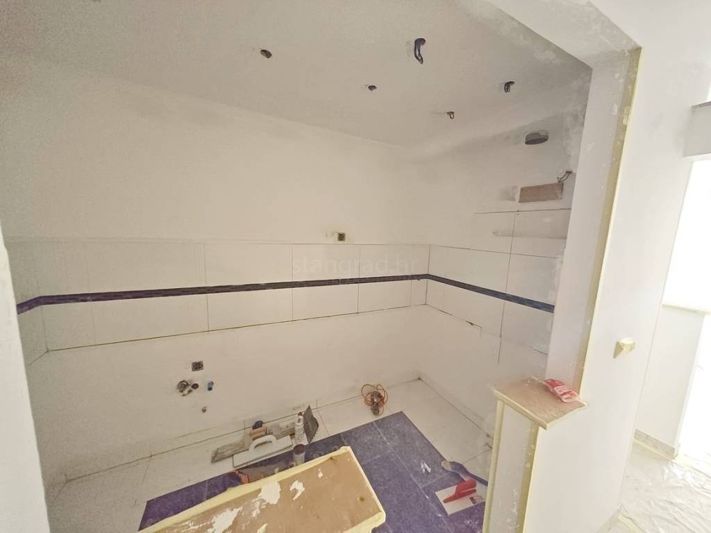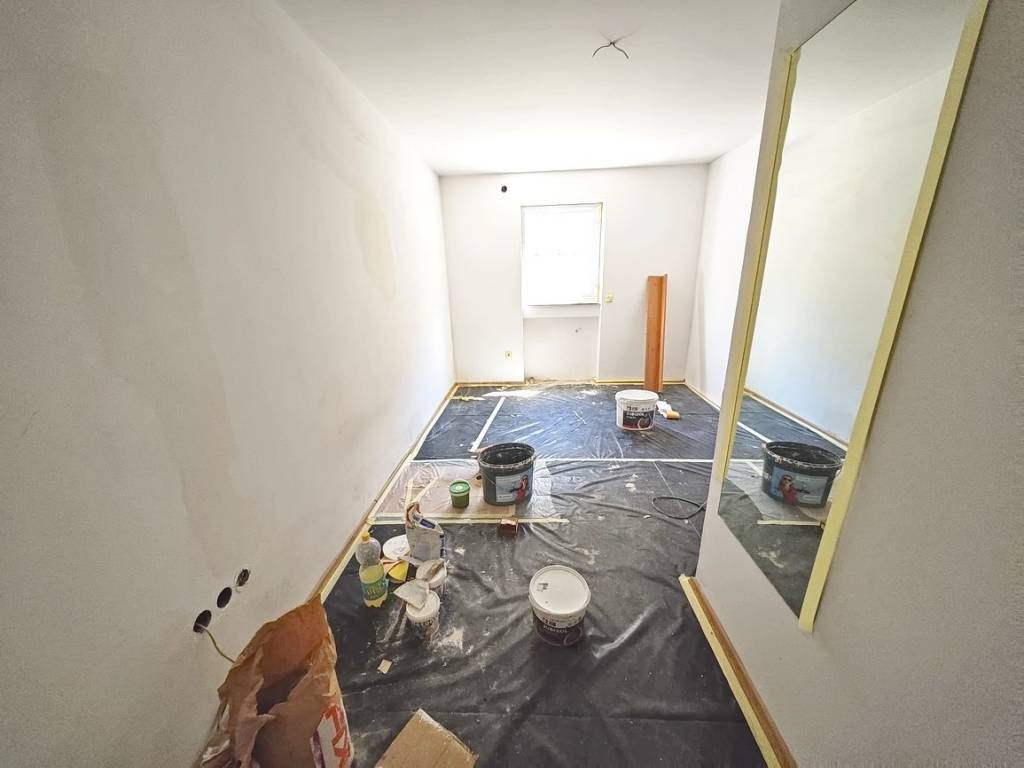 The total living area of the apartment is 67 square meters. It consists of an entrance hallway, a spacious living room with a kitchen and dining area, three bedrooms, a bathroom, an additional toilet, and a storage room. The interior has been cleared of furniture and fully renovated. As part of the renovation, new PVC windows have been installed and new laminate flooring has been laid, enhancing the fresh and well-maintained feel of the space.