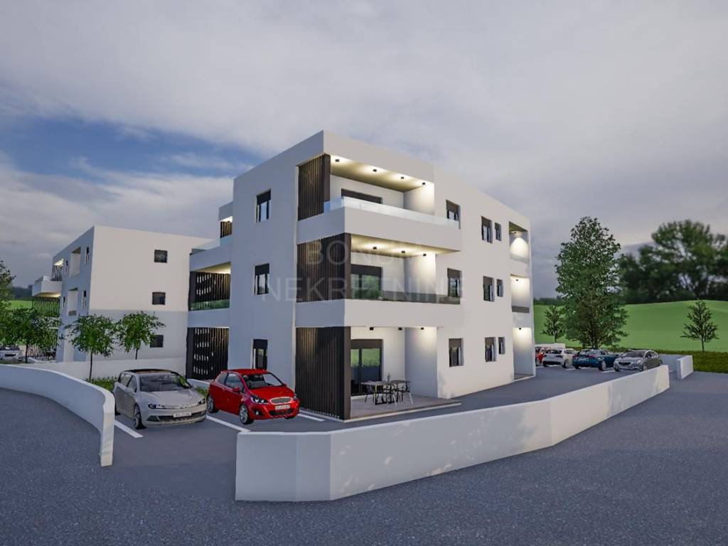 For sale is a modern two-bedroom apartment located on the second floor of a small residential building in Vodice. The total net area of ​​the apartment is 68.85 m², and it consists of an entrance, hallway, two bedrooms, bathroom, kitchen with dining room and living room, and a terrace of 14.12 m². The apartment also comes with one parking space.