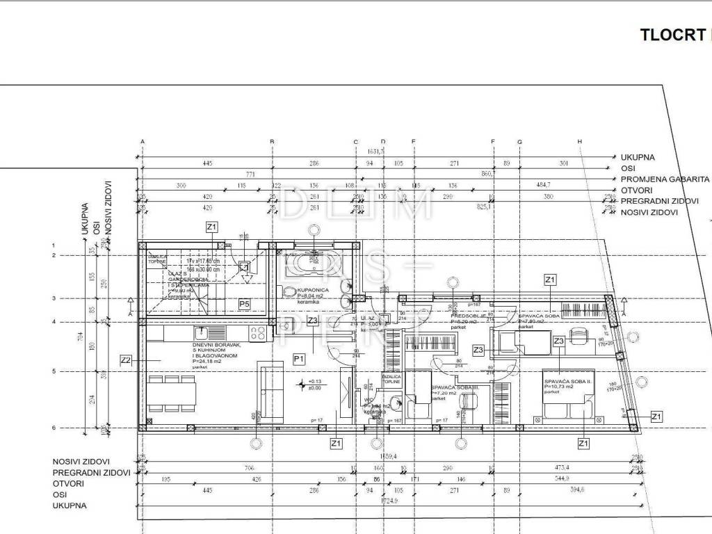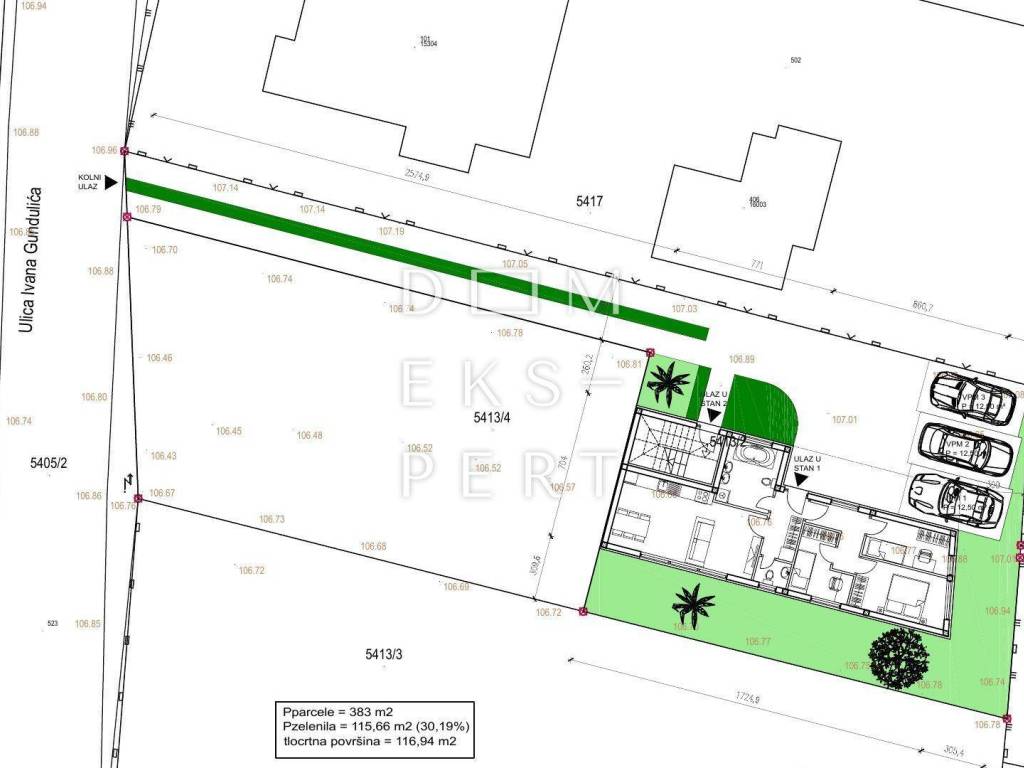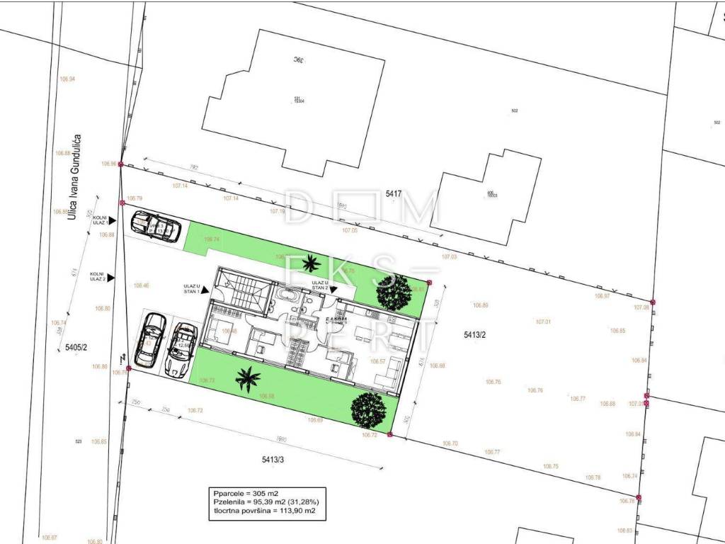 Parcelirano je na dvije čestice, a na svakoj čestici je predviđen po jedan objekt s dvije stambene jedinice.