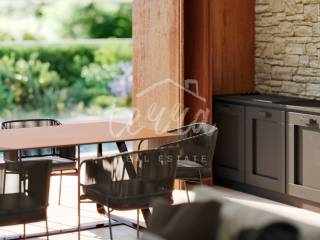 In the outdoor area we find a heated swimming pool of 30 m2, 10 m long, 3 m wide, a sunbathing area with deck chairs, a covered summer kitchen with a dining table and chairs and a covered lounge area with seating.
