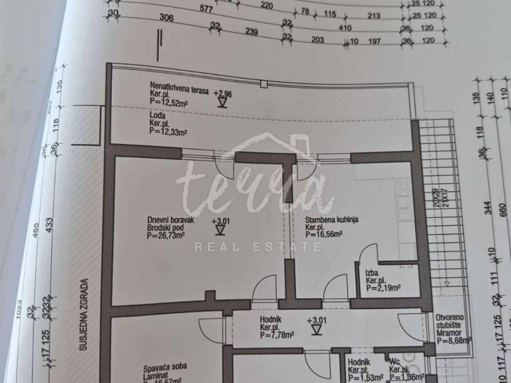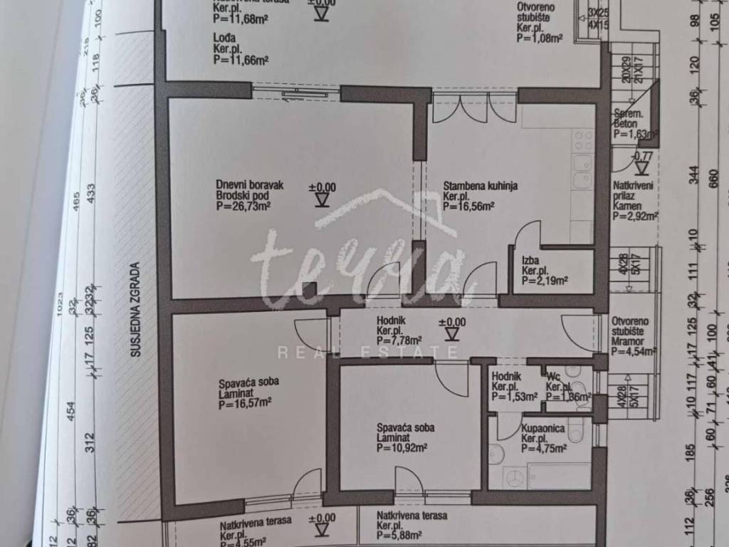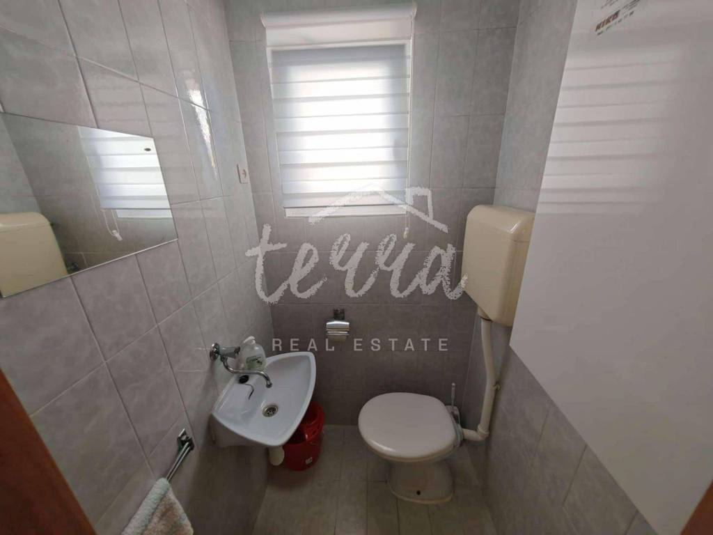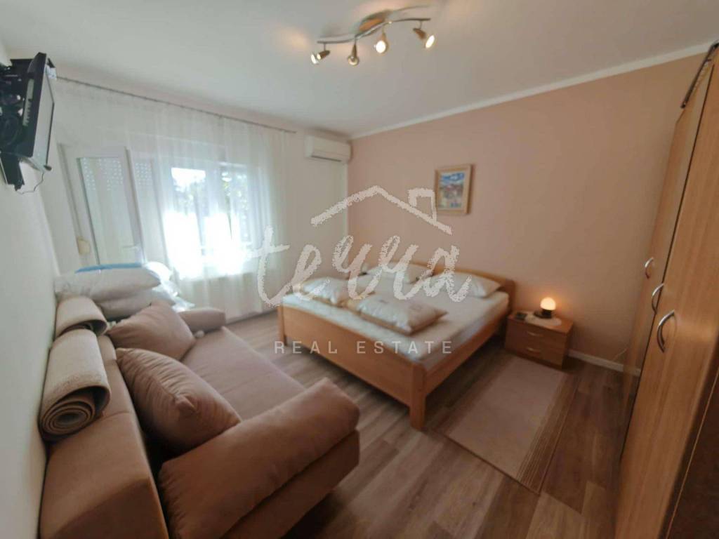 We are selling a ground floor in a house in a great location just 150m from the sea. On the ground floor there is a bathroom, separate toilet, two spacious bedrooms with access to a balcony, a kitchen with a dining room and a large living room with access to a large covered terrace of 35m2. The apartment is equipped with electric central heating and is fully air-conditioned. The house has a new roof and facade and is generally in excellent condition.