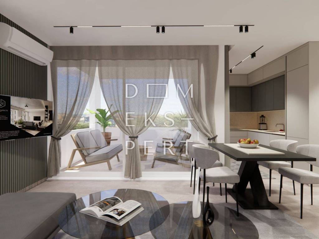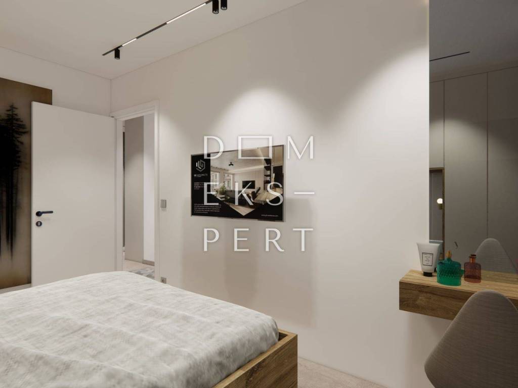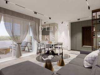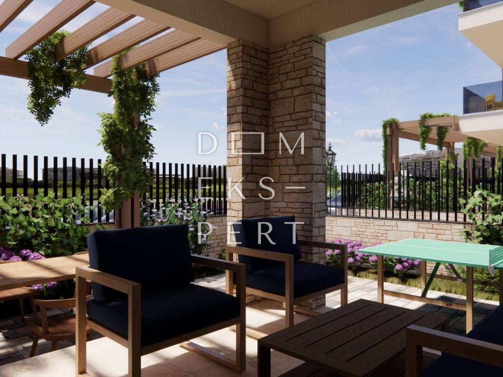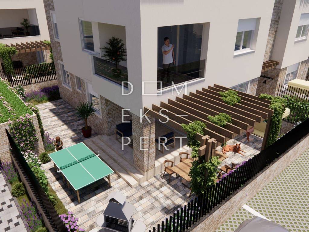 For sale: a spacious three-room apartment with a total area of 182.69 m2, located on the ground floor of a modern building in Brodarica, just 50 meters from the sea. The apartment is part of an exclusive residential complex with four buildings.
