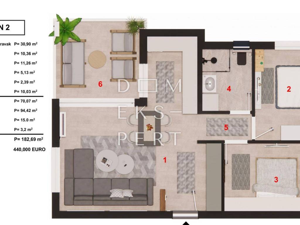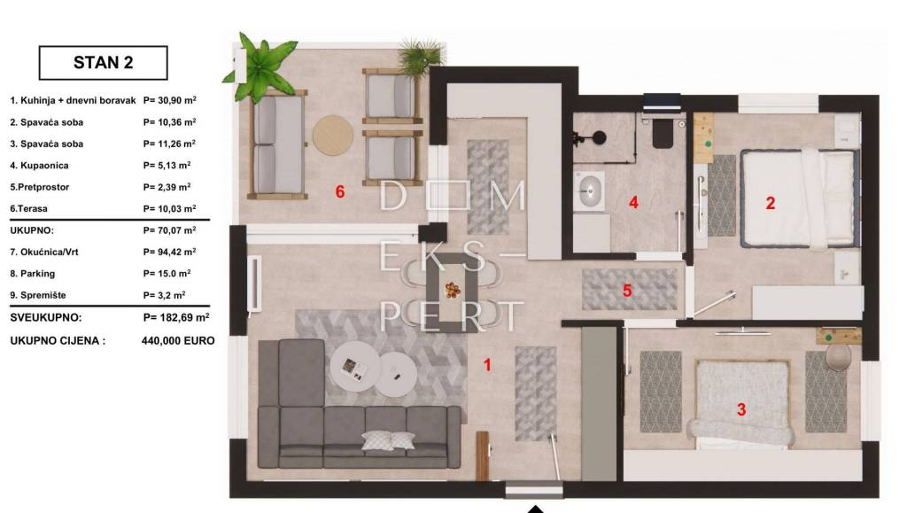 - total area including terrace, garden, parking space, and storage: 182.69 m2