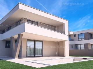 In terms of property type, the building can be categorized as a detached two-story house with one residential unit. The modernly designed house offers useful space spread over two floors. The house covers a total gross area of 213 m2 (net 173 m2). This area includes an entrance space, a living room with a kitchen and dining area, one bedroom with a bathroom, a separate WC, a relax room with a sauna, 2 storage rooms, and a large covered terrace on the ground floor. On the upper floor, there are 3 bedrooms with access to a terrace, 2 bathrooms, and a walk-in closet. The interior of the property is equipped with high-quality technical equipment and well-chosen furniture pieces. The ownership of this house includes a carefully landscaped yard, enhanced by a 25 m3 swimming pool, a sunbathing area, and two parking spaces.