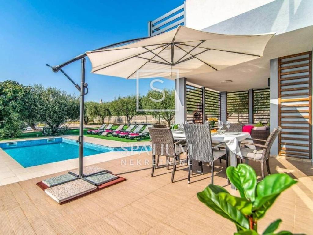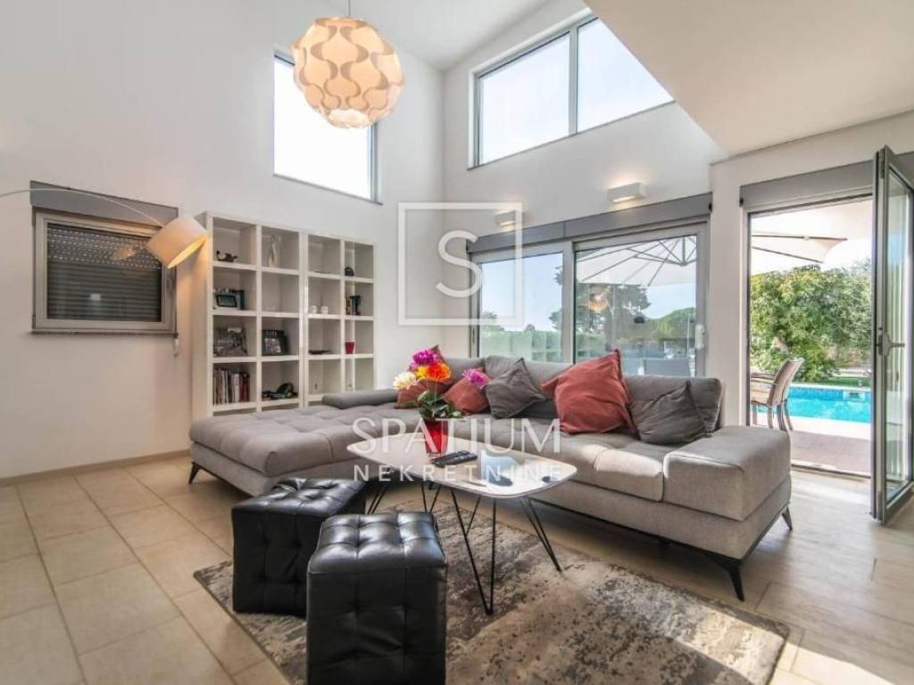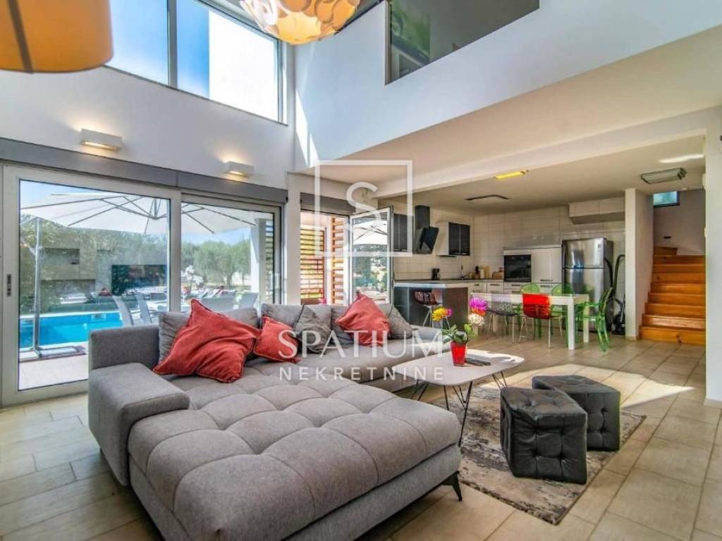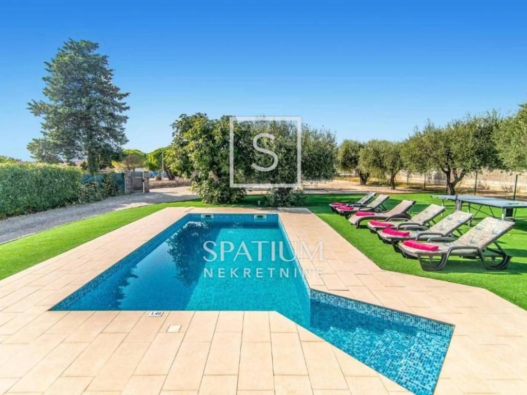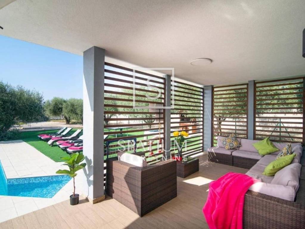 VODNJAN, we present a modern villa situated in a unique and peaceful location, offering the perfect combination of luxury, privacy and functionality. The villa extends over 173 m² of fully equipped and furnished living space, positioned on a spacious and beautifully landscaped plot of 1,294 m² with a Mediterranean ambiance. The interior features three spacious, air-conditioned bedrooms filled with natural light, an elegantly designed living room, and a modern kitchen connected to the dining area. The outdoor area includes a heated swimming pool with a sunbathing deck, ideal for year-round use, as well as seven private parking spaces. An additional highlight is the well-maintained olive grove within the property, which yields 20 to 30 liters of premium olive oil annually. The villa has been successfully rented out for many years, with proven income and a base of returning guests, making it an excellent choice both for personal use and for investors seeking a secure and profitable tourist property.