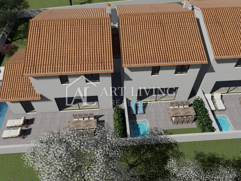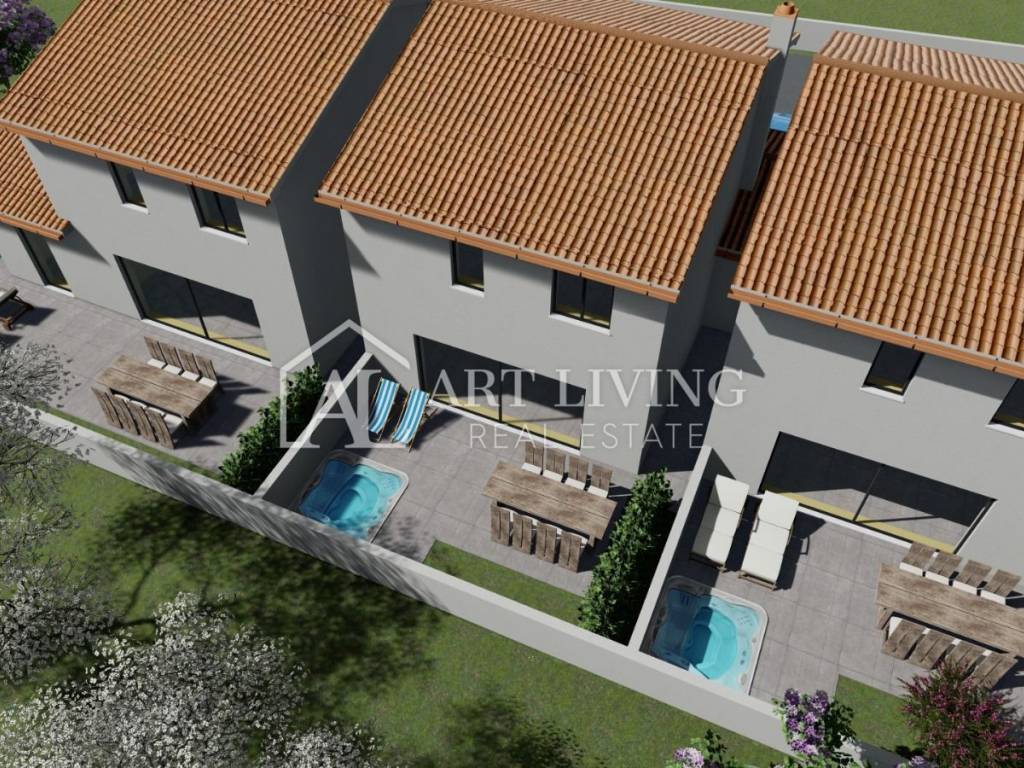 A modern terrace house with a spacious yard is for sale in the surroundings of Umag, just 1000 meters from the sea and well-maintained beaches, 2.5 km from the center of Umag, and 13 km from the Slovenian border.
