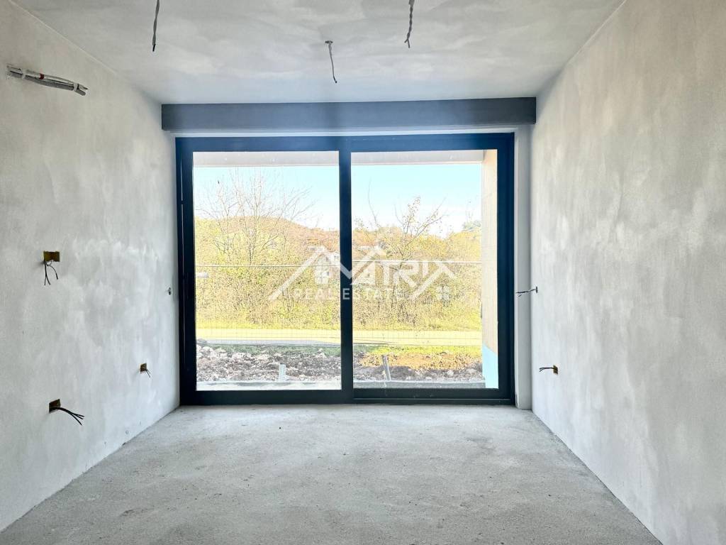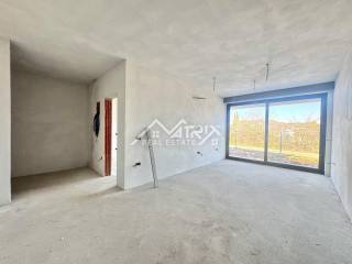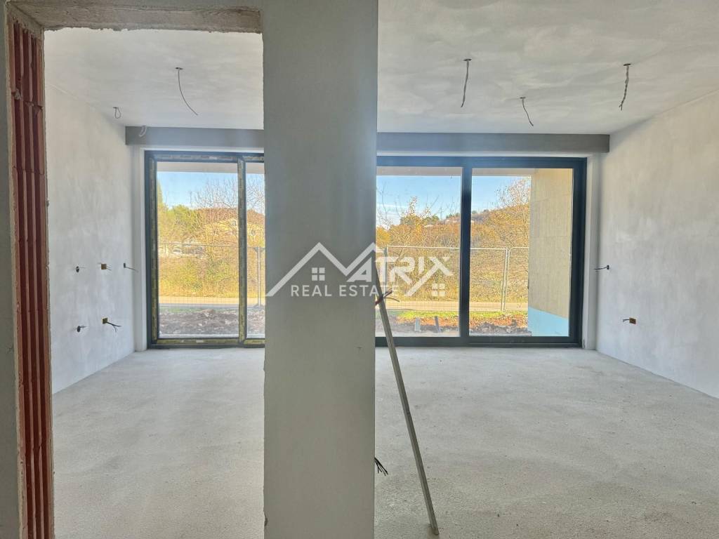 Heating and cooling are provided via a MultiSplit system, while underfloor heating is installed in the bathroom and kitchen. The floor coverings include Italian tiles throughout the apartment, except in the bedroom, where wooden flooring is provided. Large glass portals are made of white PVC joinery with an anthracite-colored aluminum exterior cladding. Triple glazing and aluminum roller shutters with electric lifts further improve the quality of the stay, and the balcony doors are lift-sliding. The lowered part of the ceiling at the glass portal hides the cornice, which contributes to the elegant appearance of the space.