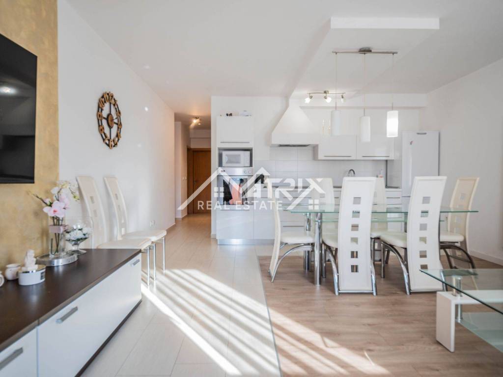 The apartment offers a net living area of 59.79 m² and consists of an entrance hallway, a kitchen connected to the living room, two bedrooms, a bathroom, and two covered terraces that extend the living space and allow you to enjoy the outdoors. One of the apartment’s highlights is the abundance of natural light throughout the day, creating an airy and comfortable environment. The interior is tastefully and modernly furnished and move-in ready, with no additional investment required.