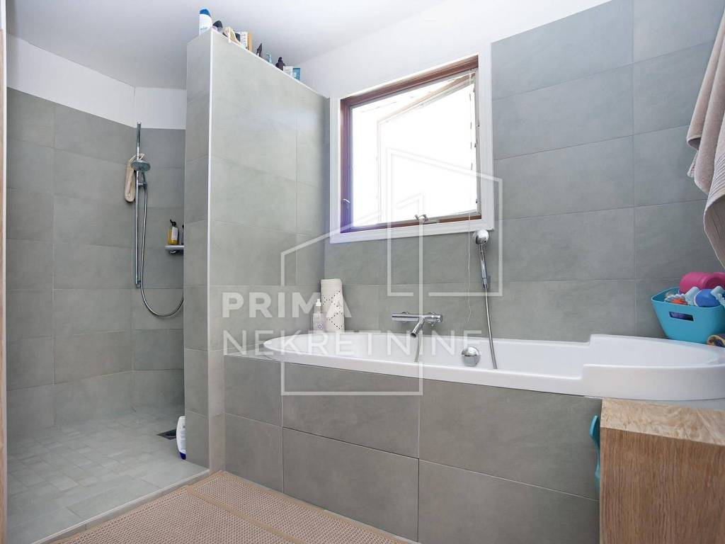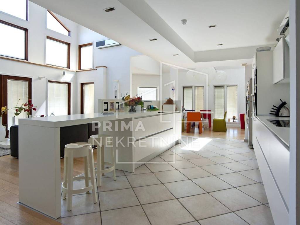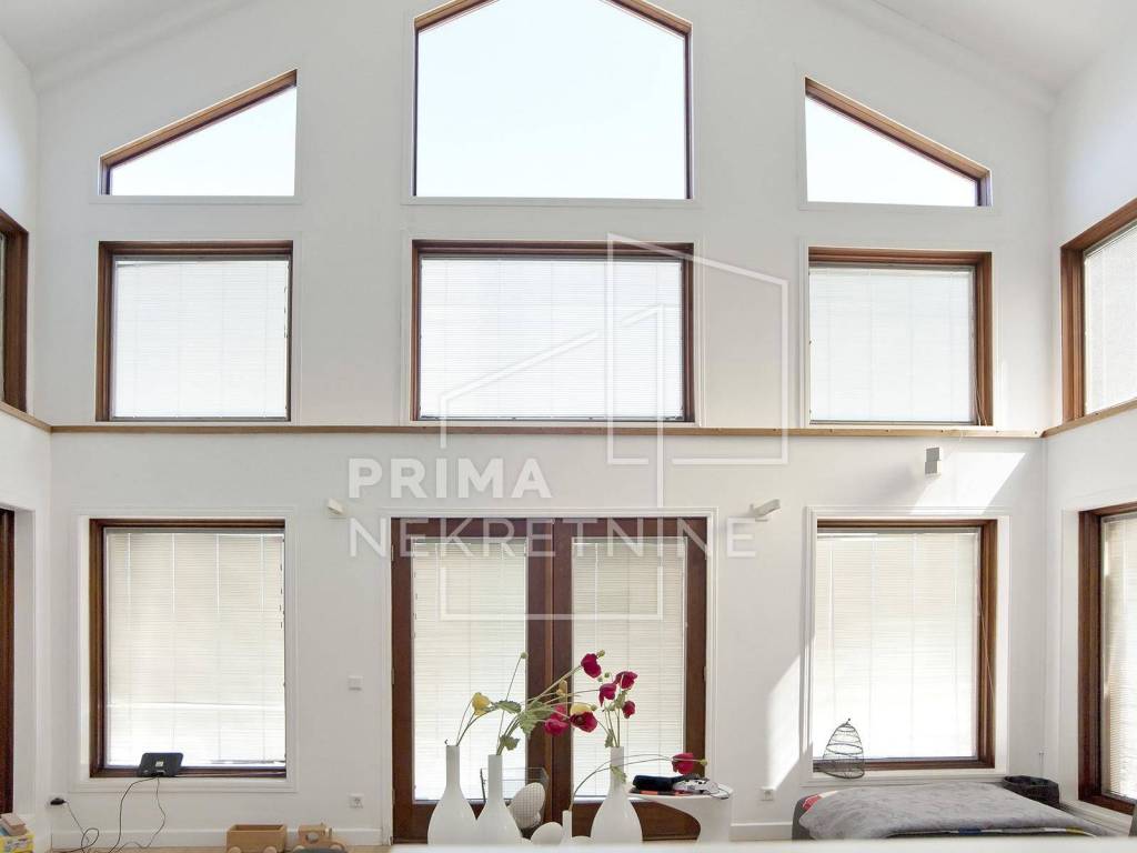 - ground floor with an area of ​​144.38 m2, in which there is a large atrium where there is a living room, connected to an open-concept kitchen and dining room, a room, a toilet and a utility room with a boiler room and a storage room.