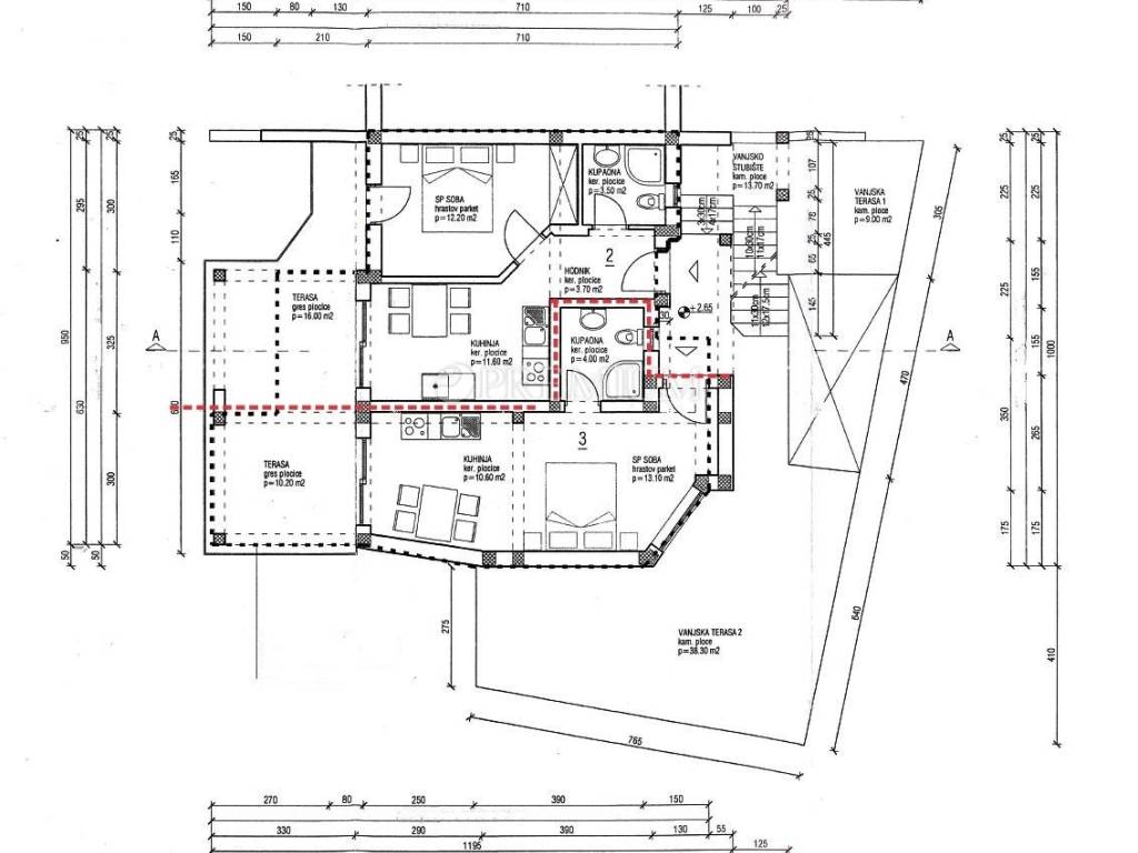 The first apartment can be described as a one-room apartment with one bedroom, bathroom, kitchen, dining room and living room with access to the terrace. The bedroom also has access to the terrace. The second apartment is a studio apartment with access to the terrace. The terrace is separated by a sliding wall that provides complete privacy.