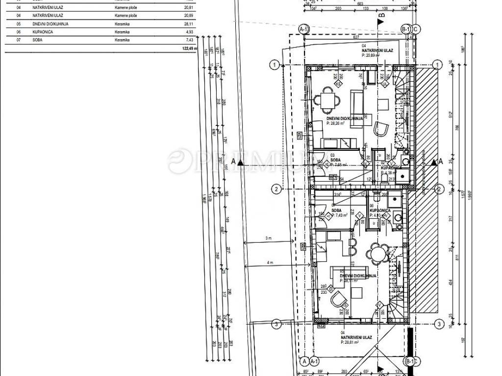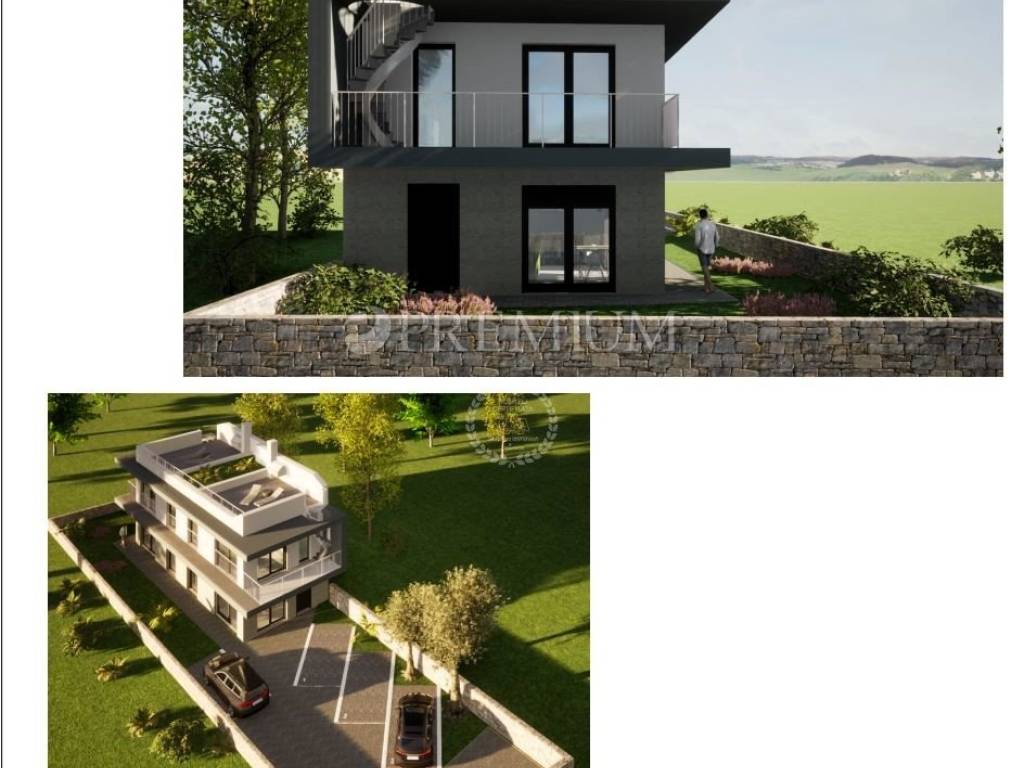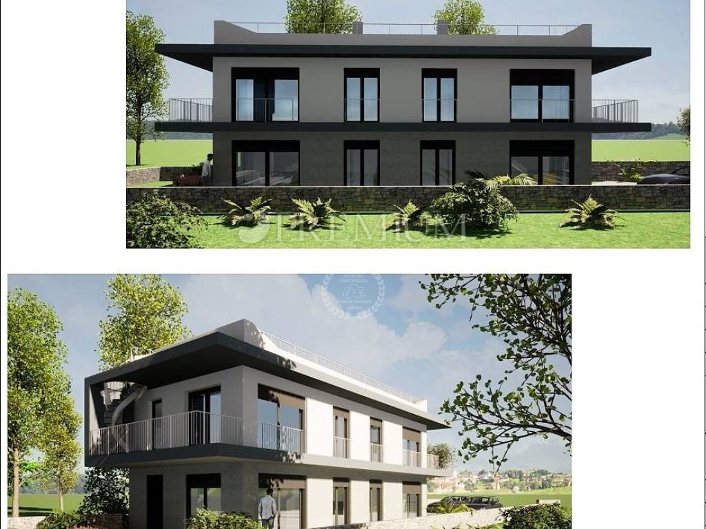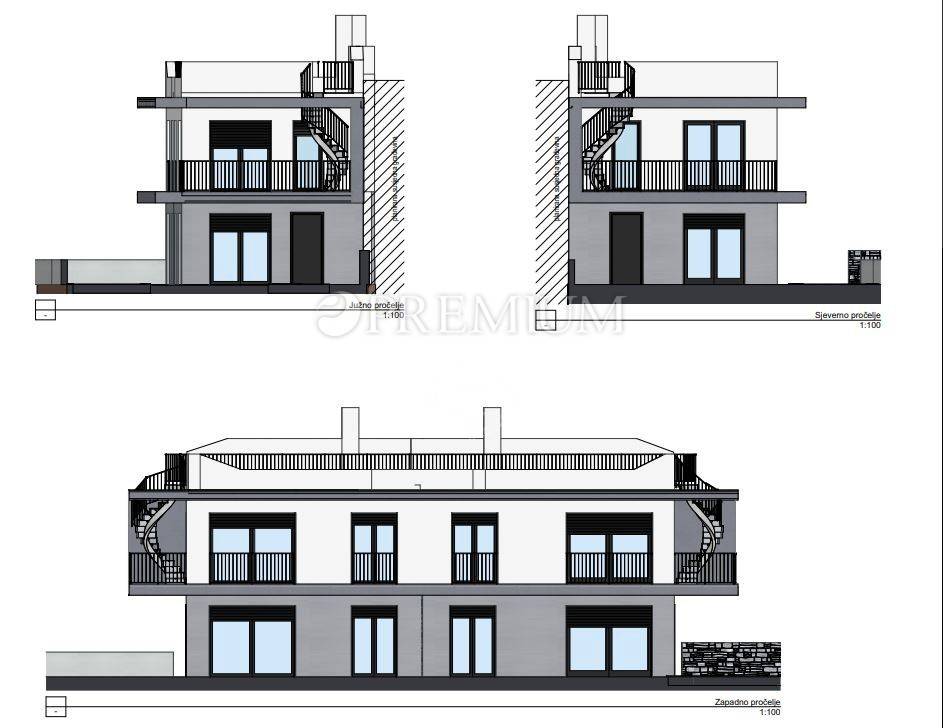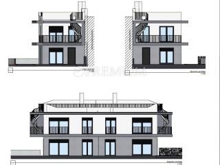 According to the reconstruction project, a detached house with two residential units is planned, consisting of a ground floor and first floor, with roof terraces, with a total surface area of 277 m². Each residential unit is designed as a two-level apartment with a functional and clearly separated living and sleeping area. The ground floor includes an entrance area, a living room with kitchen and dining area, a bathroom and one bedroom, while the first floor comprises three bedrooms, two bathrooms and a hallway, with associated balconies. On the roof level, each apartment has its own roof terrace, designed as a private outdoor area for relaxation and outdoor living. From the roof terraces, a sea view is expected. Two parking spaces are provided for each residential unit on the landscaped plot.