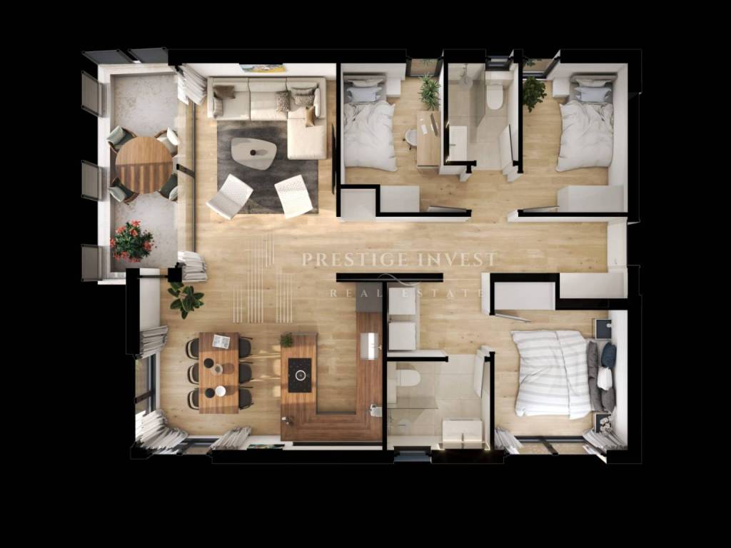 ROOM LAYOUT Apartment S2 consists of: Hallway – 9.85 m² Laundry room – 1.81 m² Kitchen and dining room – 18.67 m² Living room – 15.57 m² Bedroom 1 – 9.70 m² Bedroom 2 – 7.19 m² Bedroom 3 – 7.02 m² Bathroom 1 – 4.18 m² Bathroom 2 – 3.15 m² Hallway – 1.80 m² Loggia – 5.66 m² Total net usable area with annexes: 102.19 m²