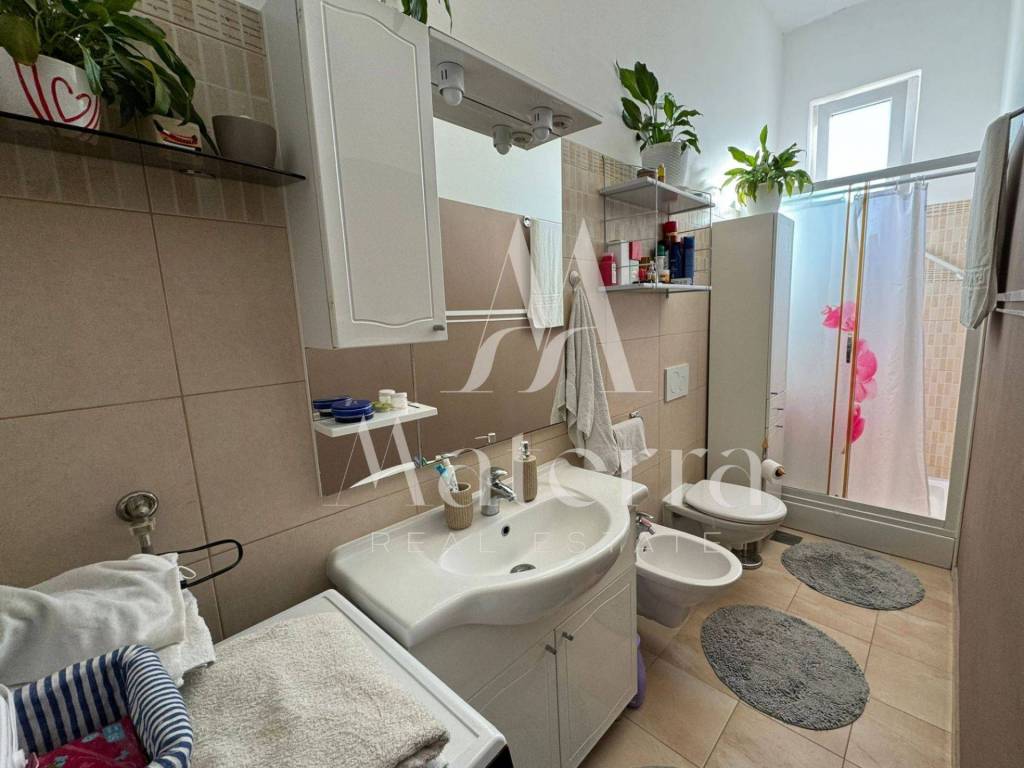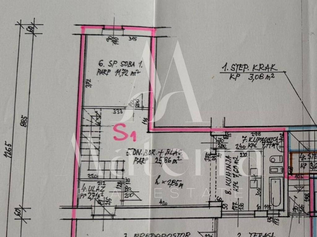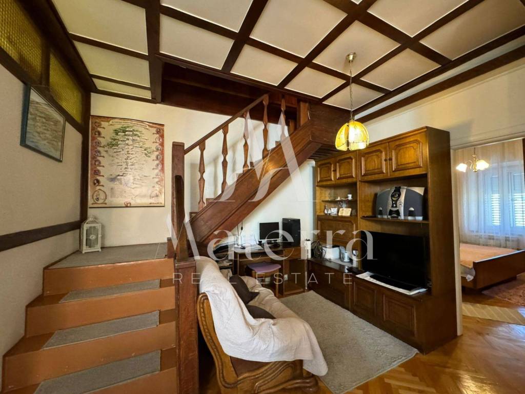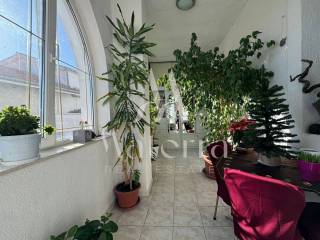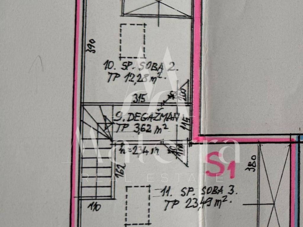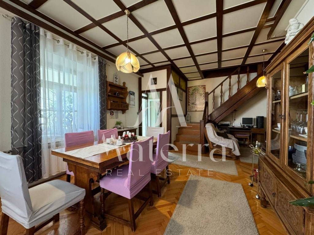 FIRST FLOOR: An internal staircase leads to the first floor, where there is an apartment with a usable area of 97.11 m². The first floor consists of a glazed hallway (winter garden), living room, dining room, and an open-plan kitchen, a bedroom with a double bed, and a renovated bathroom. Internal stairs lead to the second floor, where there is a hallway leading to 2 bedrooms with skylights. Since there is a concrete platform in the attic, it is possible to create an exit to it, which would provide a terrace with a sea view.