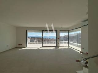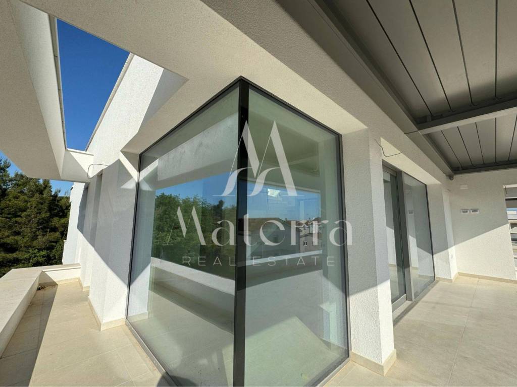 The building features an elevator, underground garage, and storage rooms. The apartment is equipped with triple-glazed aluminum joinery with insect screens and electric shutters, underfloor heating via heat pump, multi-split air conditioning system, high-quality flooring, glass railings, and decorative stone finishes on the terraces.