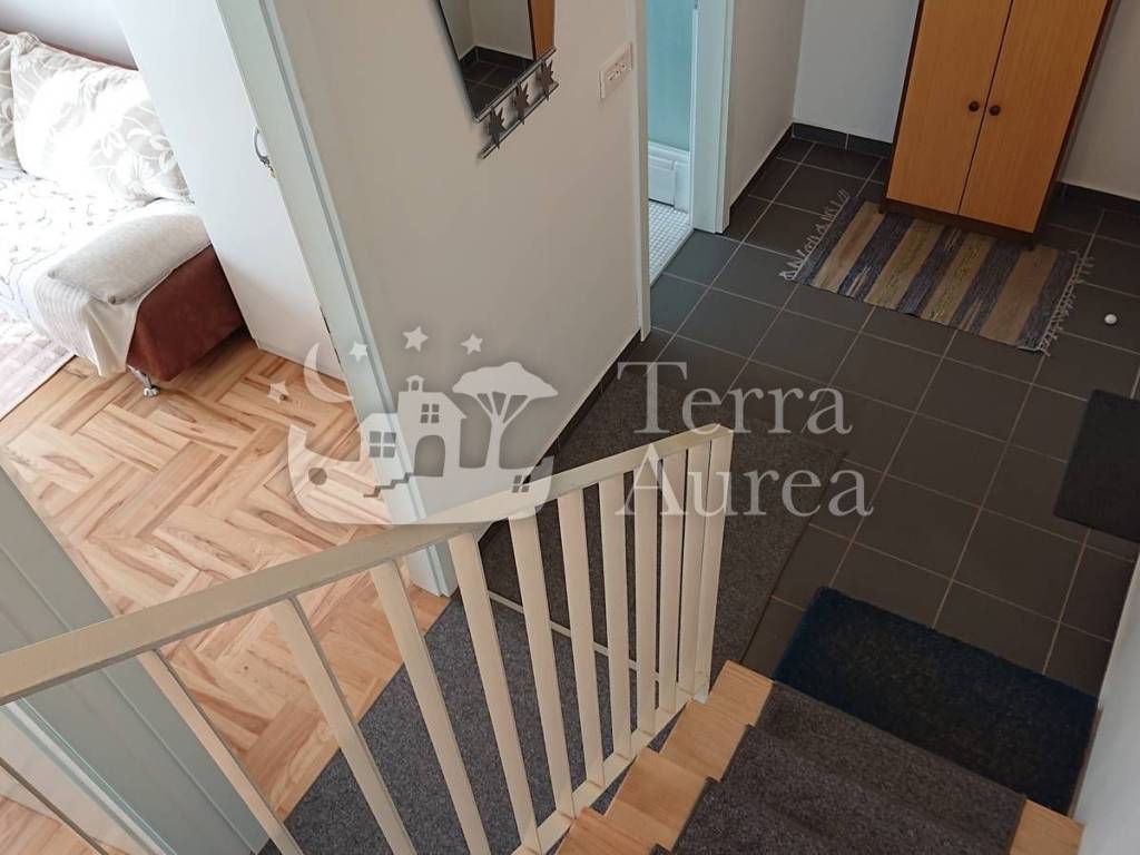 It is located in an urban villa of modern construction with only 4 apartments and extends over two floors - the first and second floors of the villa. The first floor is designed as a sleeping area, with three bedrooms, two of which are single, while one is a double. In addition, in the hallway there is also a bathroom with a shower cabin decorated with a decent white mosaic, and under the stairs there is an additional storage space that can be additionally arranged with built-in cabinets if necessary.