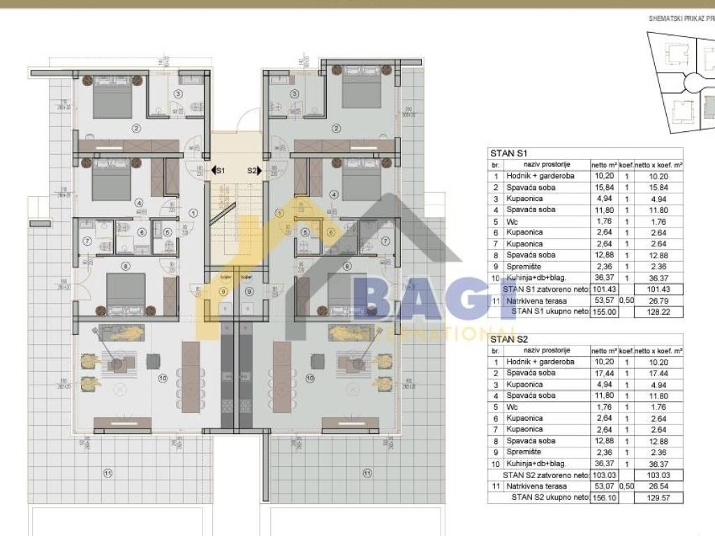 Apartment S2 consists of an entrance hall-wardrobe, open space living room with kitchen and dining room, three bedrooms with their own