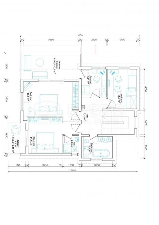 On the first floor are three more spacious bedrooms, one study and a two bathrooms.