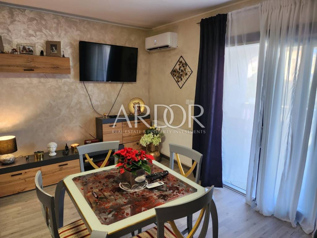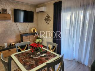 The apartment has been newly renovated and consists of two bedrooms, an open living room with a kitchen and dining area, a hallway, a bathroom, and a spacious covered terrace. It includes two parking spaces, a garage, and a landscaped yard featuring a barbecue, an outdoor stone table, and a garden – perfect for relaxation and gatherings!
