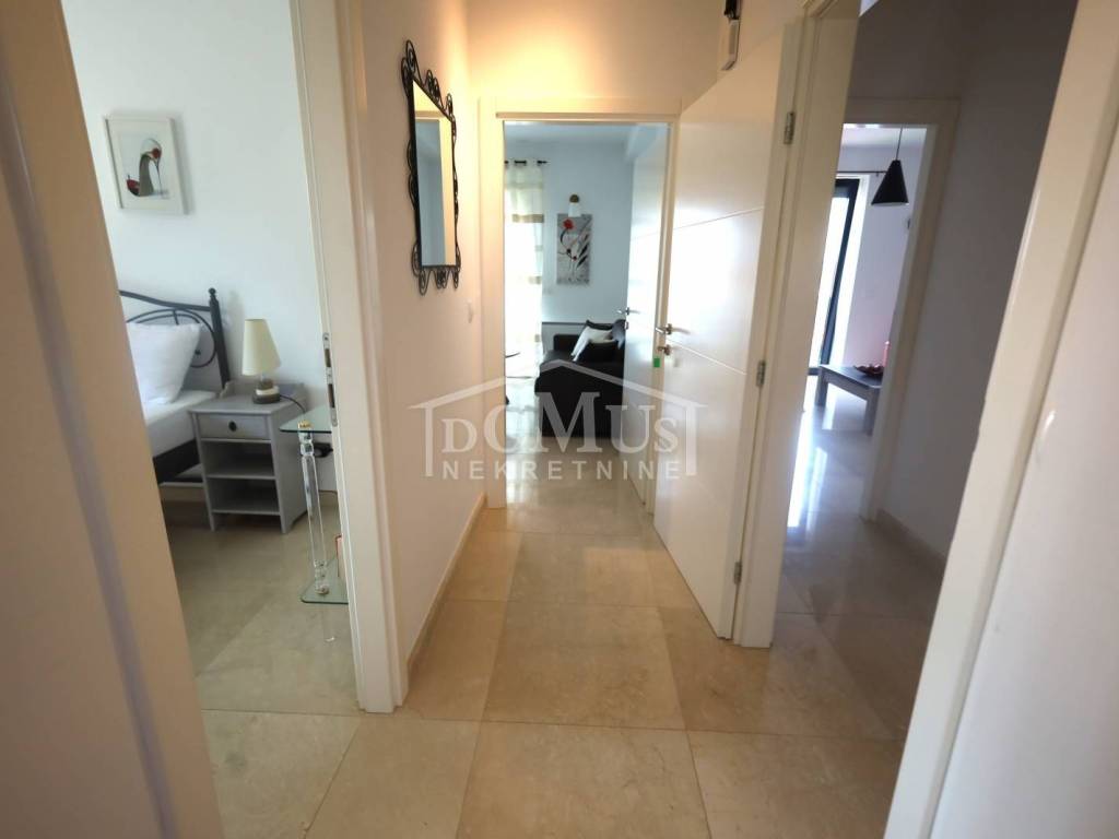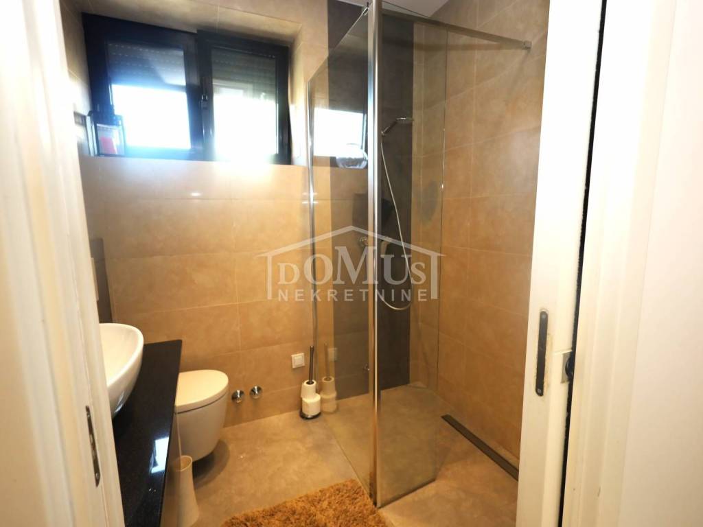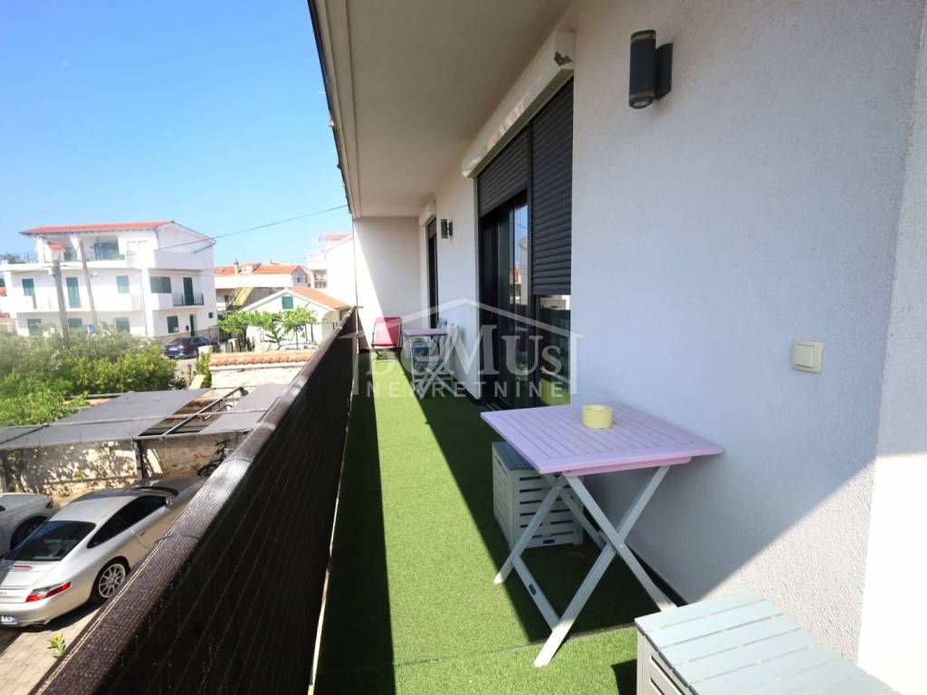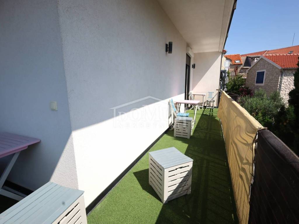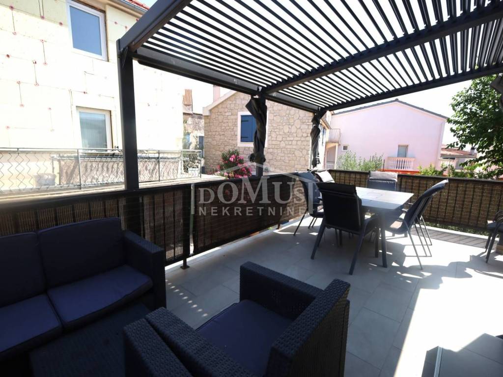 Vodice, excellent location, only 200 m from the city center, there is an apartment on the 1st floor of a building, marked S4, with a total area of 105.39 m2, which is fully equipped with furniture and inventory. The apartment consists of: entrance hall, mini kitchen I, bathroom I, dining room + living room, 1 terrace of approximately 27.oo m2 with access from three rooms, three bedrooms, two bathrooms, kitchen II, and another terrace II covered with a pergola of approximately 20.oo m2, with access from kitchen II. The apartment also has one outdoor parking space. The building is 550 m from the beach and 200 m from the city center.