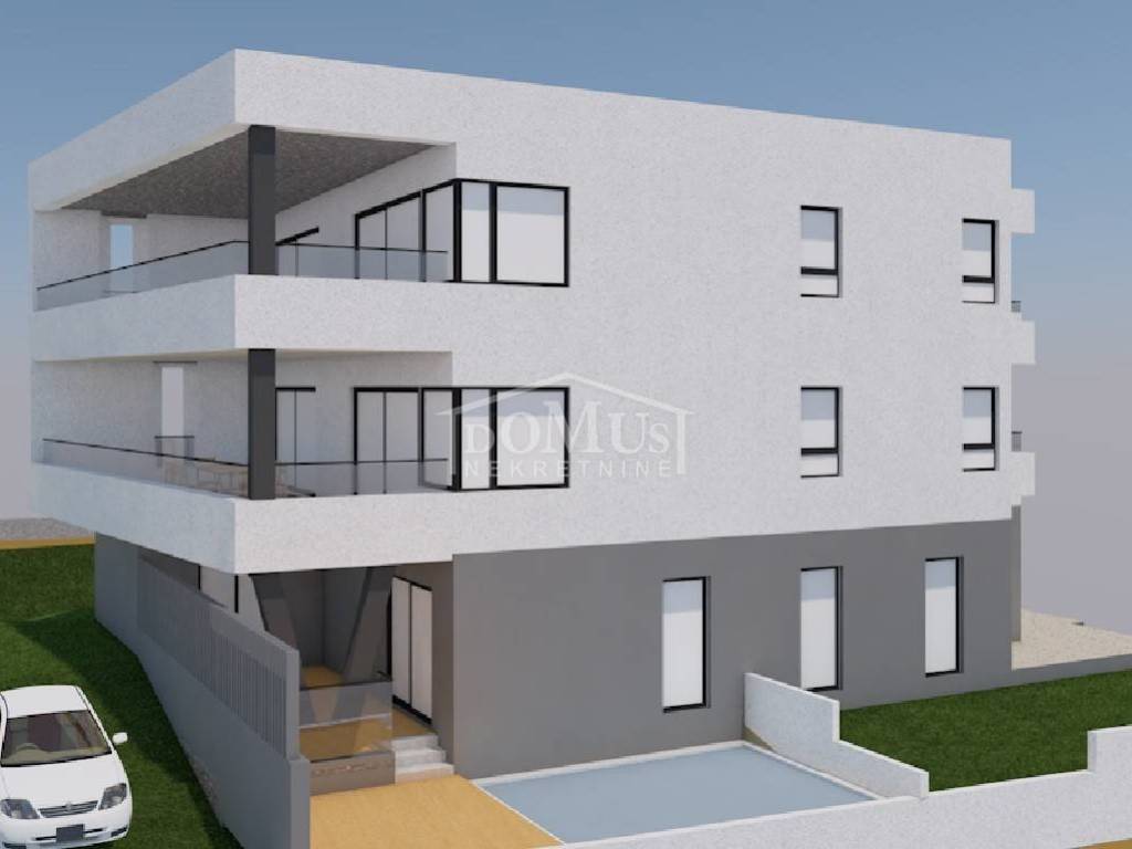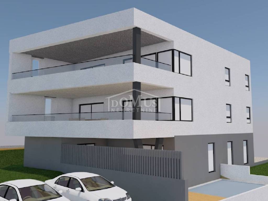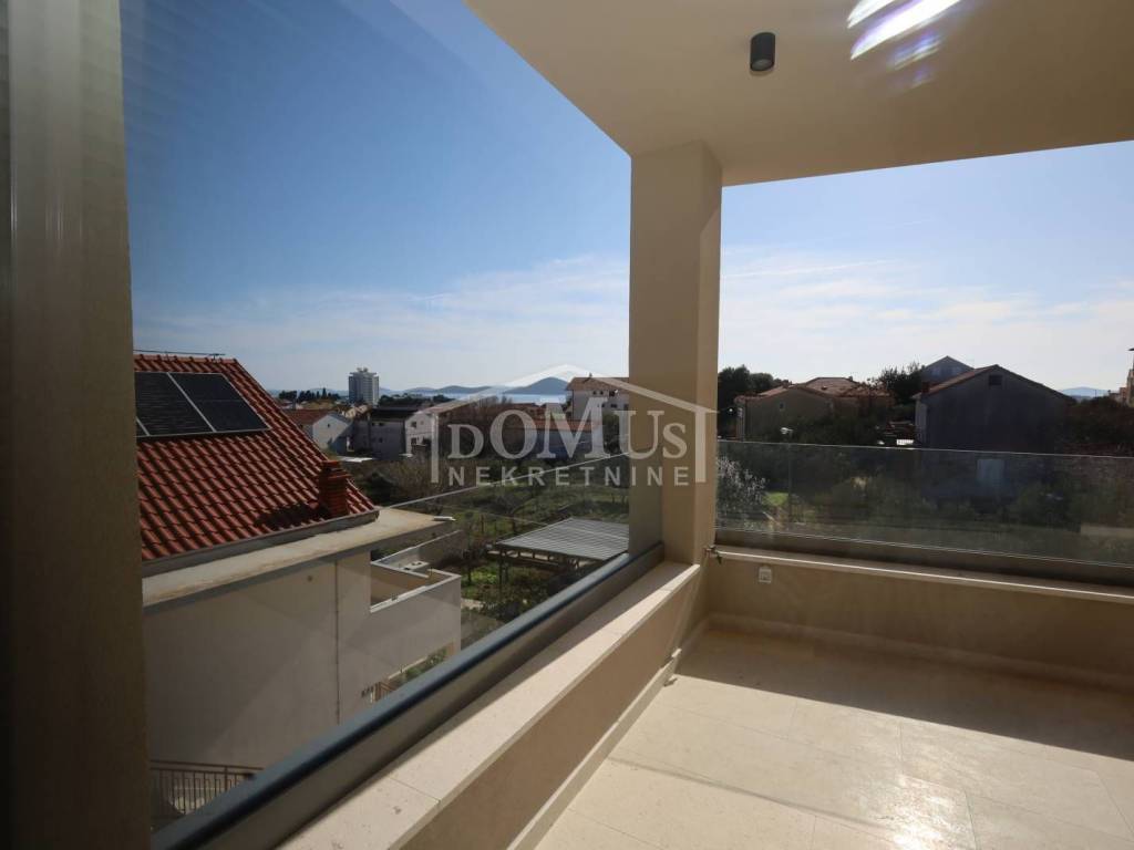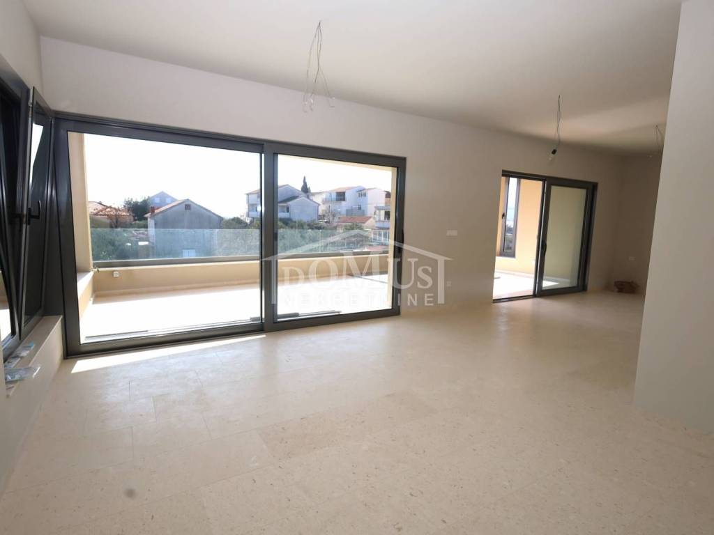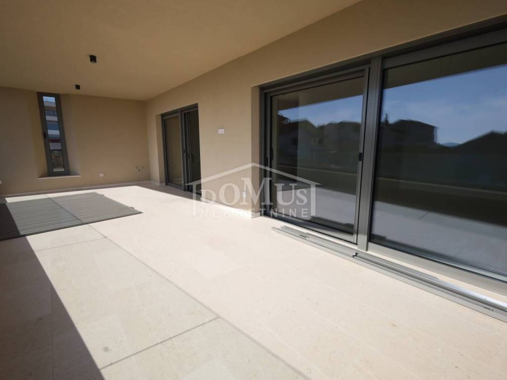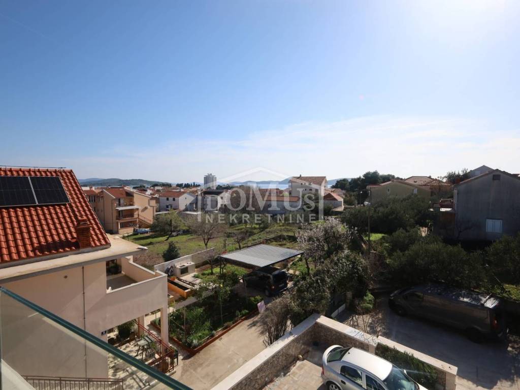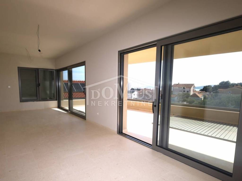 New construction – Penthouse with panoramic views of the city and the sea in a residential building with a total of 4 housing units. The building has three floors in total: ground floor + first floor + second floor. The apartment occupies the entire second floor, is oriented to the southeast, and has a total usable area of 126.73 m². It consists of an entrance hall, a living room with dining area and kitchen that opens onto a covered terrace of 38.44 m² offering a beautiful sea view, a bathroom, laundry room, and three bedrooms. One of the bedrooms has its own bathroom and a covered terrace of 17.17 m², while another bedroom has a terrace of 4.22 m². High-quality equipment includes modern bathroom fittings and flooring, air conditioning in every room, electric roller shutters, and an elevator. The expected move-in date is spring 2026. The apartment comes with two parking spaces. Distance: 750 m from the Blue Beach and 450 m from the town center and all major amenities.