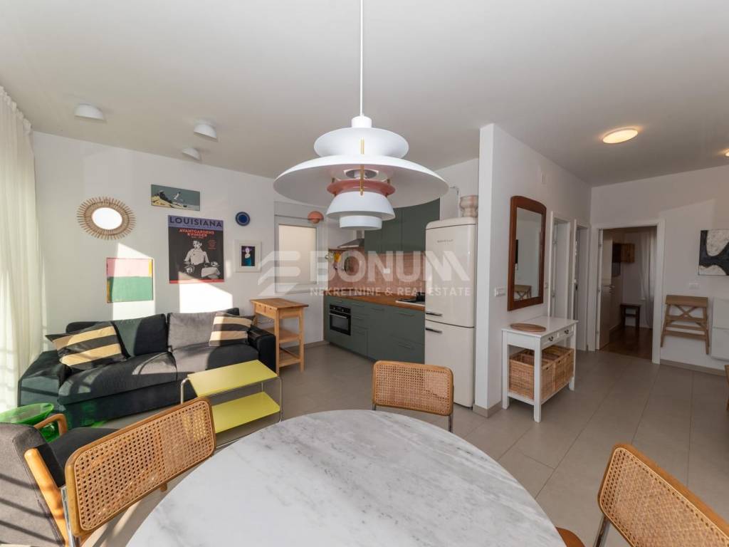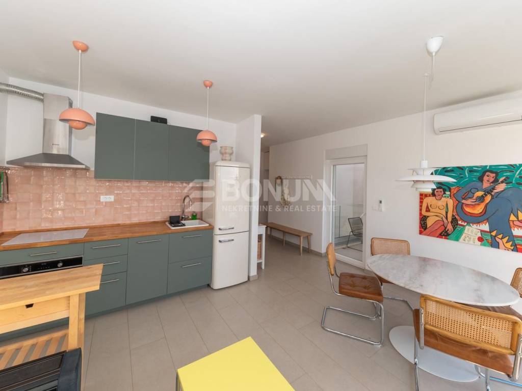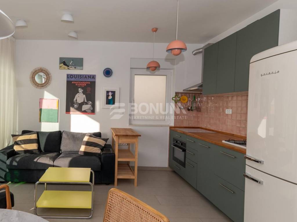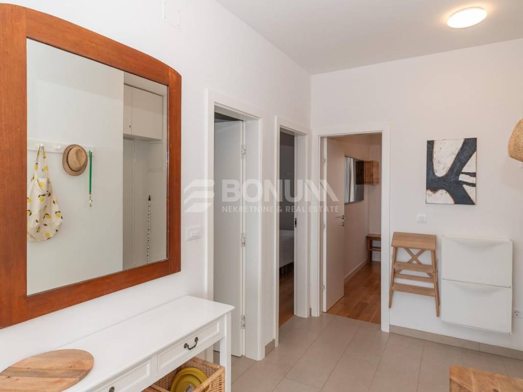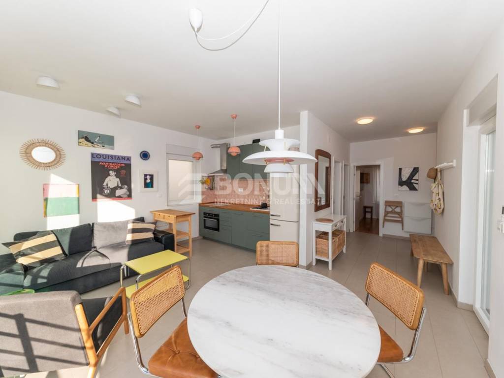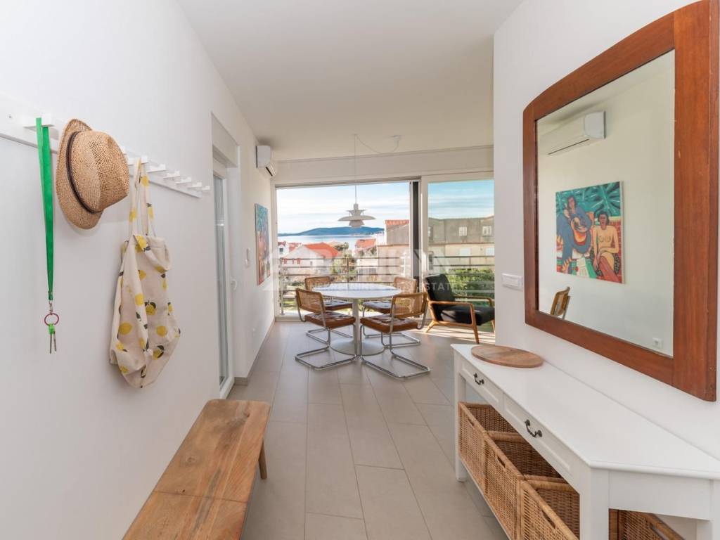 A beautiful, fully furnished apartment with sea view is located on the second and top floor of a modern, smaller residential building in the center of Žaborić, built in 2023. The apartment is situated in a quiet yet highly practical location, just a few minutes’ walk from the beach, restaurants, cafés, and a grocery store.