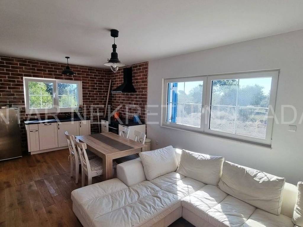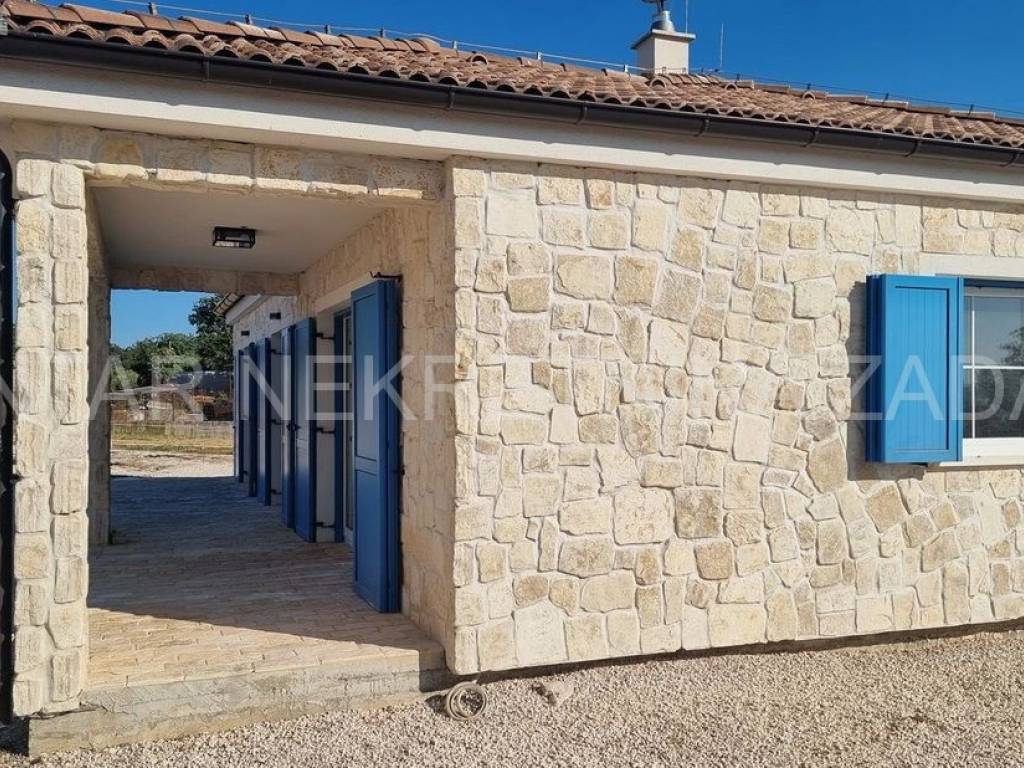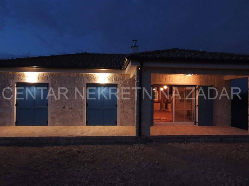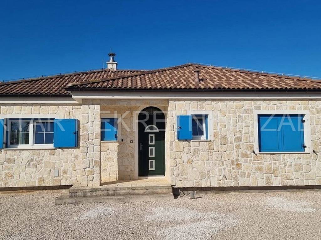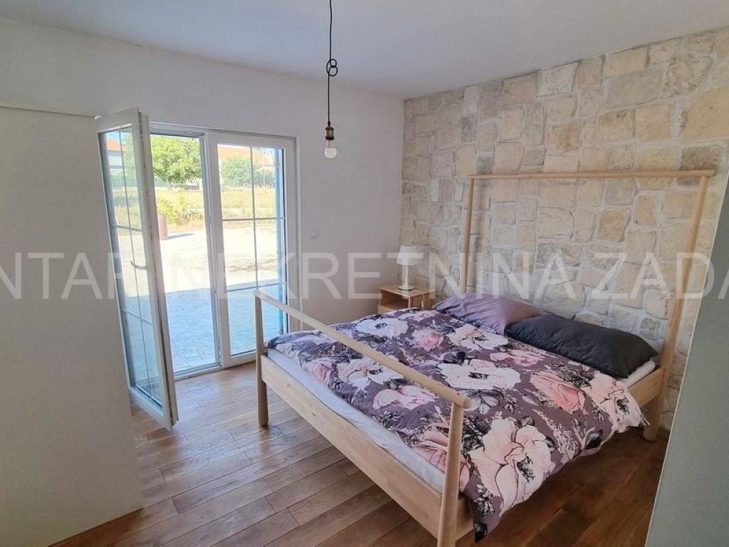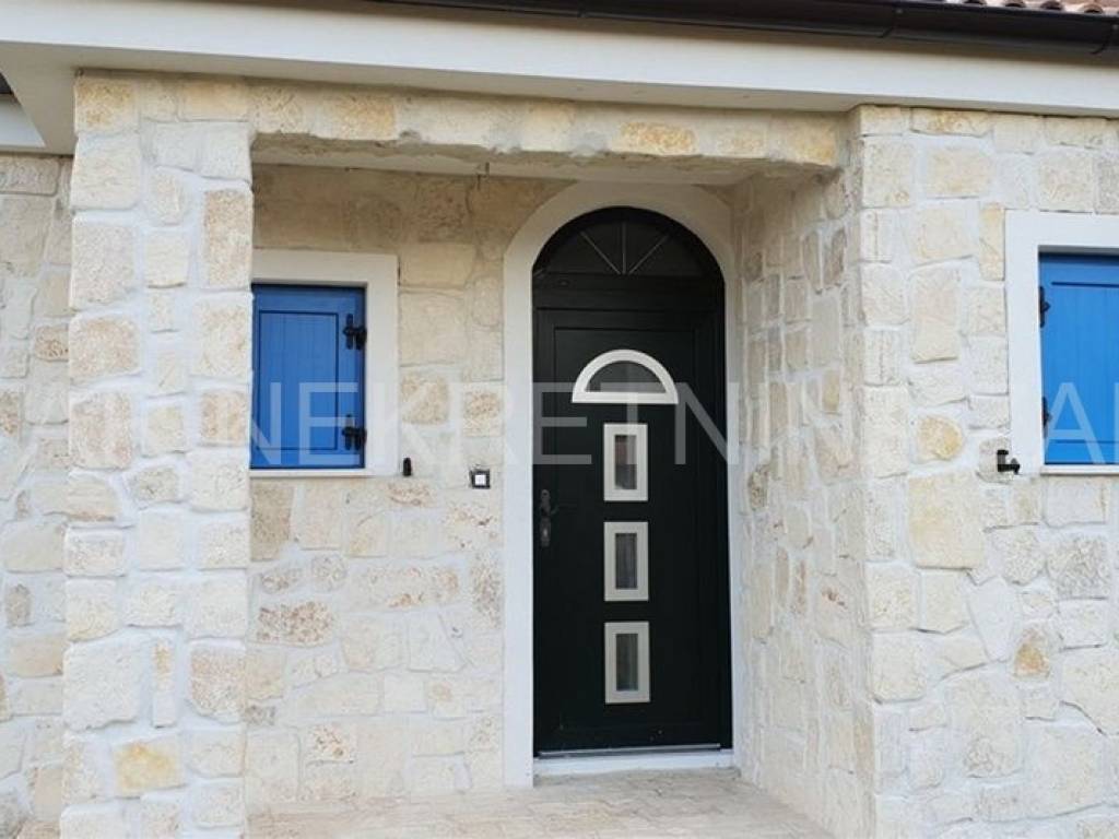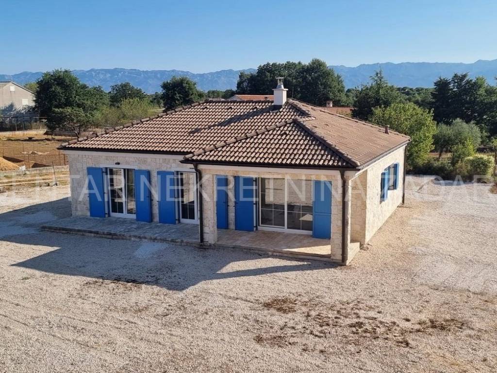 A stone ground floor house for sale in Ninski Stanovi, built in 2018 in a quiet part of the town. It has a floor area of 147 m (residential 107 m) and an excellent layout. It consists of an entrance hall and hallway, kitchen (7.87 m), dining room with living room (25.61 m), three spacious bedrooms (12-14 m), two bathrooms (5.5 and 4.76 m) and a toilet. The living room and two bedrooms open onto a tiled and partially covered terrace (10.21 m).