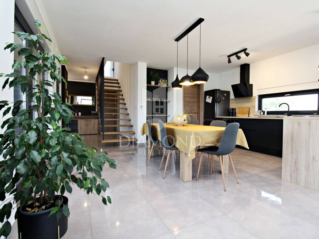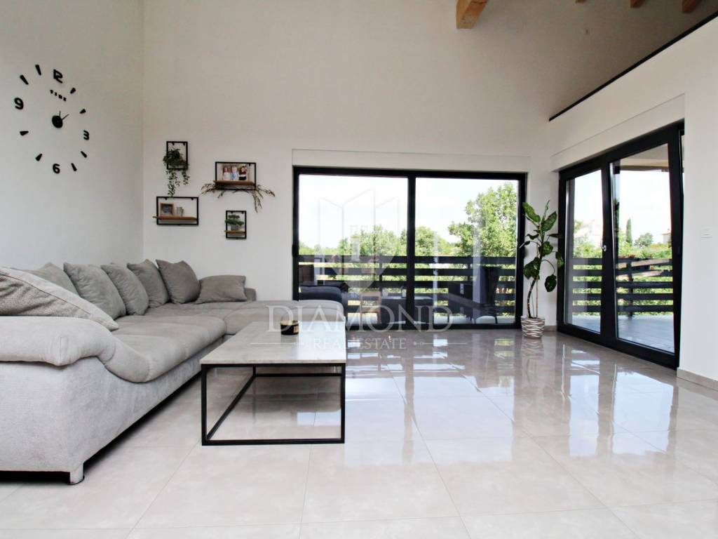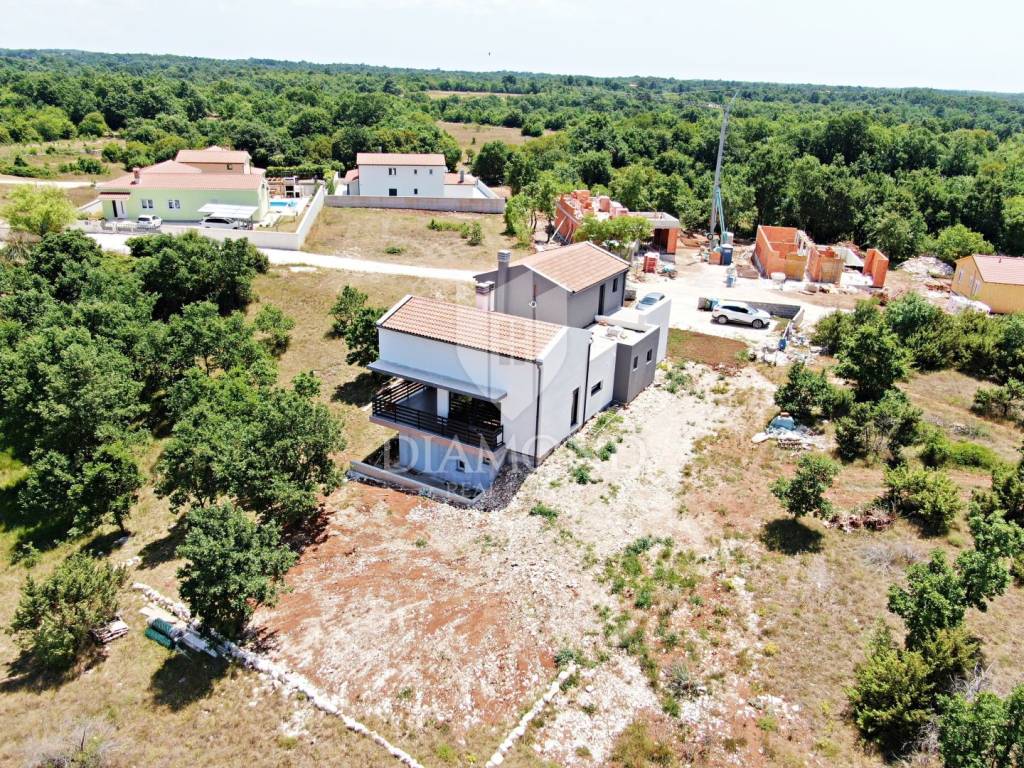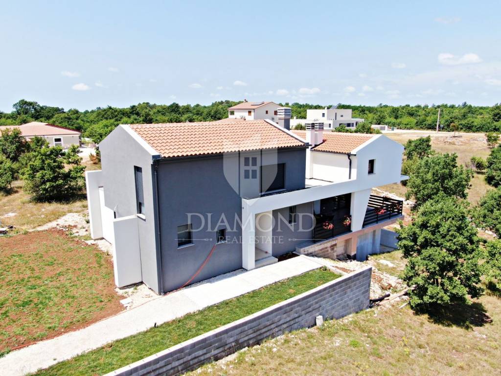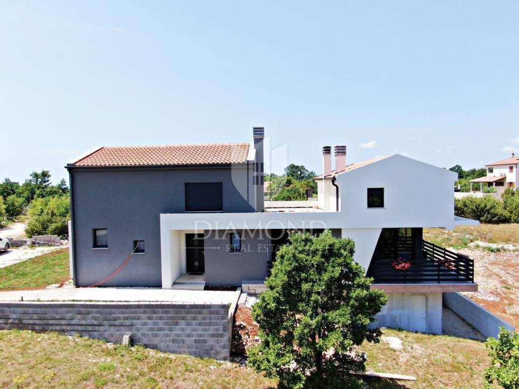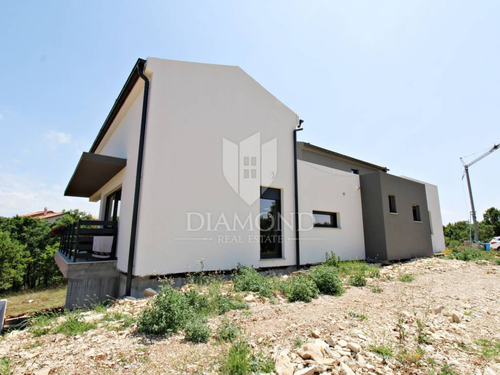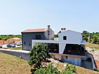 In the immediate vicinity of the increasingly popular Istrian town of Svetvinčent, we are selling this newly built villa with a modern design. This comfortable Villa consists of a basement, ground floor and first floor and has a total area of 330 m2 of living space. In the basement there is a technical room, a tavern and a toilet. The ground floor of a beautiful concept combines an open space kitchen, pantry, dining room and living room with access to a large covered terrace where a summer kitchen and dining area are provided. In the living room, large glass walls have been installed, which provide enough natural light, but also a sense of airiness of the space with an open view of the green garden. A bridge is planned from the terrace, which would be a link to the beach of the pool. There is also a guest toilet, two bedrooms, a bathroom and a gallery intended for a study. At the current stage, the floor is not completely finished and consists of two bedrooms and one shared bathroom. There is also an exit to the upper open terrace, which offers a beautiful view of the mountain Učka on the one hand, and the surrounding landscape and the sea on the other. There is a jacuzzi and a lounge area on the terrace. The owner also offers the possibility of selling a fully finished property with a landscaped garden and a 45 m2 swimming pool at a price of €690,000. The house has underfloor heating and air conditioning, which makes it comfortable for a year-round stay. It is ideally located in the very center of Istria, only 6 kilometers from the center of Svetvinčent, which is full of tourist attractions and meaningful events. The property is certainly worthy of attention due to its excellent location, quality construction and great potential for tourist rental, but we can also imagine it as a luxurious family home within easy reach of all amenities important for permanent living.