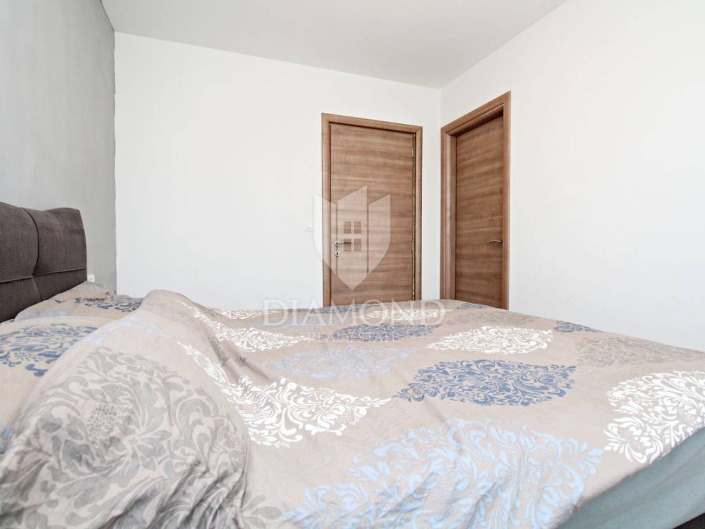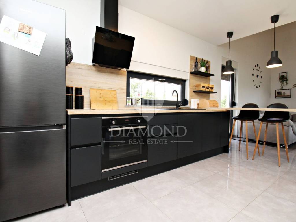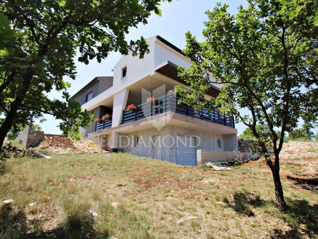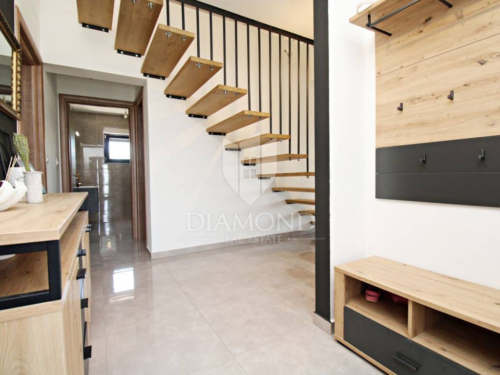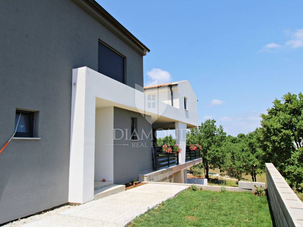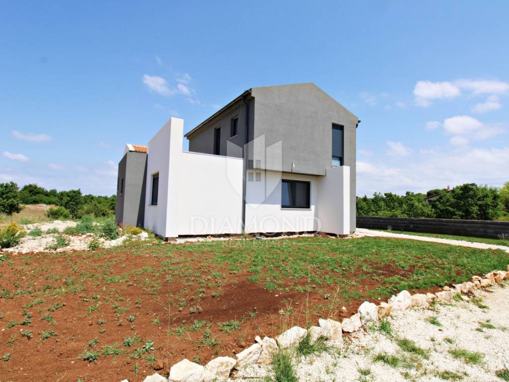 In the immediate vicinity of the increasingly popular Istrian town of Svetvinčent, we are selling this newly built villa with a modern design. This comfortable Villa consists of a basement, ground floor and first floor and has a total area of 330 m2 of living space. In the basement there is a technical room, a tavern and a toilet. The ground floor of a beautiful concept combines an open space kitchen, pantry, dining room and living room with access to a large covered terrace where a summer kitchen and dining area are provided. In the living room, large glass walls have been installed, which provide enough natural light, but also a sense of airiness of the space with an open view of the green garden. A bridge is planned from the terrace, which would be a link to the beach of the pool. There is also a guest toilet, two bedrooms, a bathroom and a gallery intended for a study. At the current stage, the floor is not completely finished and consists of two bedrooms and one shared bathroom. There is also an exit to the upper open terrace, which offers a beautiful view of the mountain Učka on the one hand, and the surrounding landscape and the sea on the other. There is a jacuzzi and a lounge area on the terrace. The owner also offers the possibility of selling a fully finished property with a landscaped garden and a 45 m2 swimming pool at a price of €690,000. The house has underfloor heating and air conditioning, which makes it comfortable for a year-round stay. It is ideally located in the very center of Istria, only 6 kilometers from the center of Svetvinčent, which is full of tourist attractions and meaningful events. The property is certainly worthy of attention due to its excellent location, quality construction and great potential for tourist rental, but we can also imagine it as a luxurious family home within easy reach of all amenities important for permanent living.