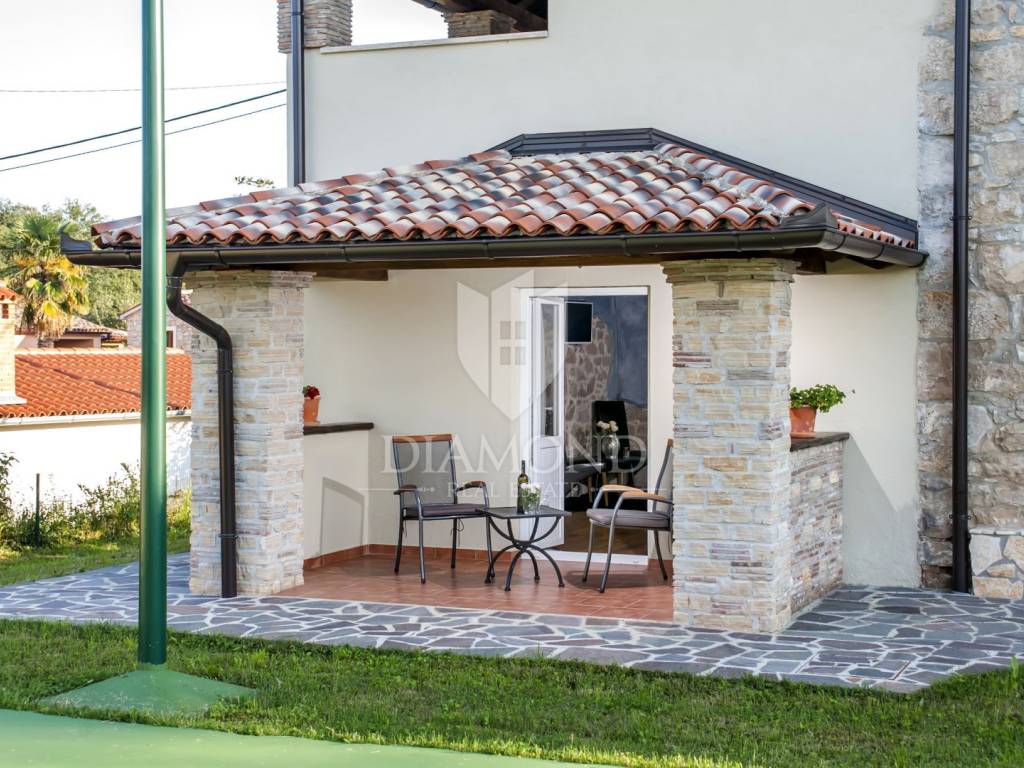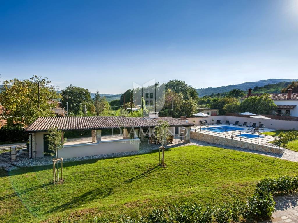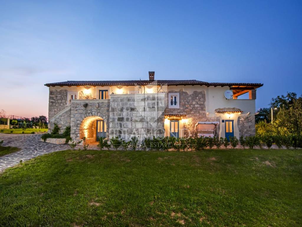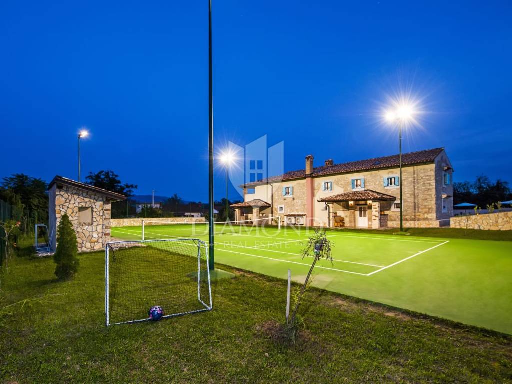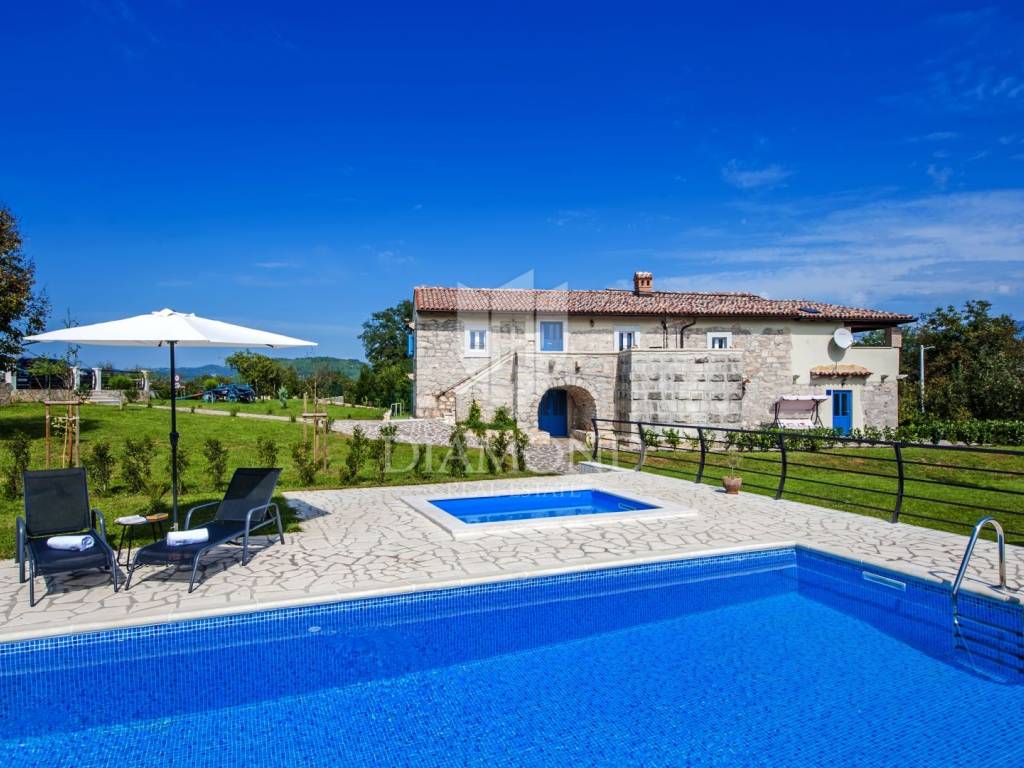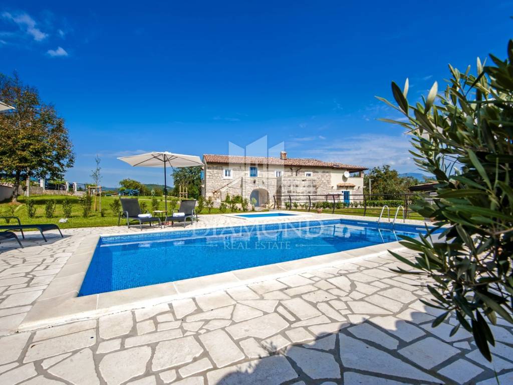 Kršan, surroundings, we are selling an autochthonous old villa which, with its design and a handful of contents, is breathtaking at first sight. The villa was built in 1926 and completely renovated in 2017. Both outside and inside, it is decorated with exceptional style and attention to detail that combines wood, stone and steel in a beautiful combination for a comfortable and functional life. The villa has a total area of 183 m2 of living space which extends to the ground floor and first floor. The ground floor consists of a comfortable living room, fully equipped kitchen and dining room. There is also a guest toilet and laundry. In the continuation of the ground floor, with a separate entrance, there is another bedroom with bathroom. Upstairs are three comfortable bedrooms, each with its own bathroom. The issue of heating and cooling is solved by a beautiful fireplace located in the living room, and air conditioners that are installed in all bedrooms. The interior design in all rooms perfectly complements the indigenous spirit of this beautiful property and creates the ideal atmosphere for a perfect vacation or luxurious family life. The garden is 2825 m2, fenced and has two accesses - one to the open parking for two cars and the other, covered parking with an automatic gate for two more cars. In addition to a handful of various facilities such as a beautiful summer kitchen with a bread oven and barbecue, two swimming pools - one larger than 54 m2 and one smaller, children's 9 m2, tennis court with auxiliary facility and beautiful terraces with beautiful views, concept the garden offers both privacy and peace. Also, the garden is beautifully landscaped and maintained with planted Mediterranean plants and an orchard with various fruit trees. A house that certainly stands out in the offer and has a well-established tourist rental business during the season, which the new owner has the opportunity to take over and continue. The location is well connected with the paved access road, 4 km away to the first shop, bakery, cafes, restaurants, schools, kindergartens and clinics, and 3 km to the medieval town of Pićan.
