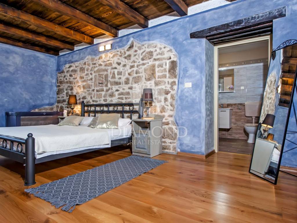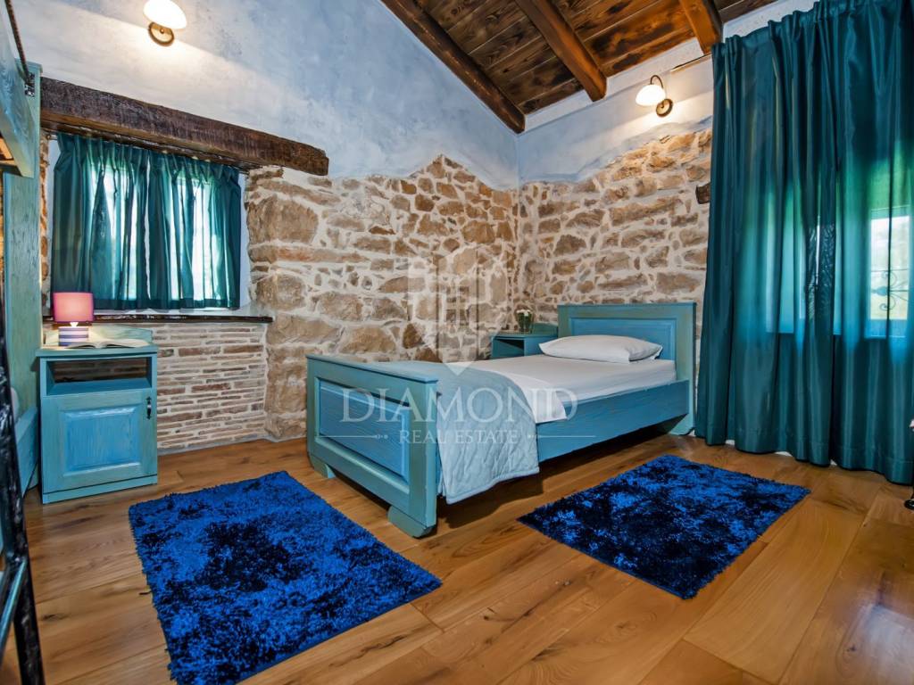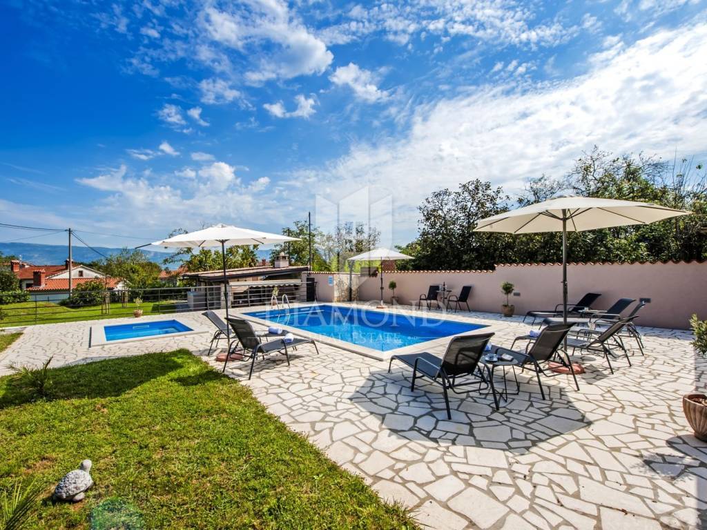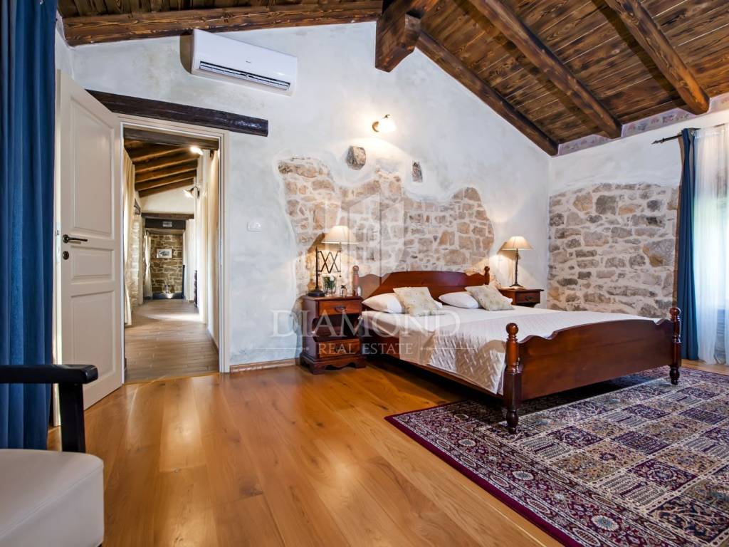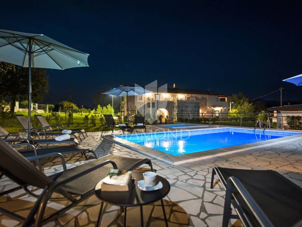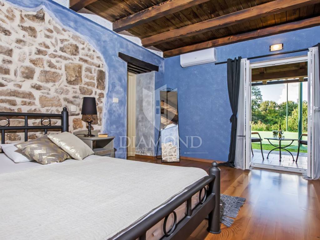 Kršan, surroundings, we are selling an autochthonous old villa which, with its design and a handful of contents, is breathtaking at first sight. The villa was built in 1926 and completely renovated in 2017. Both outside and inside, it is decorated with exceptional style and attention to detail that combines wood, stone and steel in a beautiful combination for a comfortable and functional life. The villa has a total area of 183 m2 of living space which extends to the ground floor and first floor. The ground floor consists of a comfortable living room, fully equipped kitchen and dining room. There is also a guest toilet and laundry. In the continuation of the ground floor, with a separate entrance, there is another bedroom with bathroom. Upstairs are three comfortable bedrooms, each with its own bathroom. The issue of heating and cooling is solved by a beautiful fireplace located in the living room, and air conditioners that are installed in all bedrooms. The interior design in all rooms perfectly complements the indigenous spirit of this beautiful property and creates the ideal atmosphere for a perfect vacation or luxurious family life. The garden is 2825 m2, fenced and has two accesses - one to the open parking for two cars and the other, covered parking with an automatic gate for two more cars. In addition to a handful of various facilities such as a beautiful summer kitchen with a bread oven and barbecue, two swimming pools - one larger than 54 m2 and one smaller, children's 9 m2, tennis court with auxiliary facility and beautiful terraces with beautiful views, concept the garden offers both privacy and peace. Also, the garden is beautifully landscaped and maintained with planted Mediterranean plants and an orchard with various fruit trees. A house that certainly stands out in the offer and has a well-established tourist rental business during the season, which the new owner has the opportunity to take over and continue. The location is well connected with the paved access road, 4 km away to the first shop, bakery, cafes, restaurants, schools, kindergartens and clinics, and 3 km to the medieval town of Pićan.