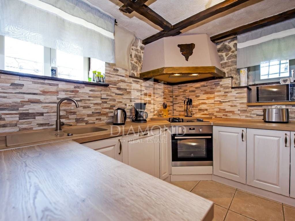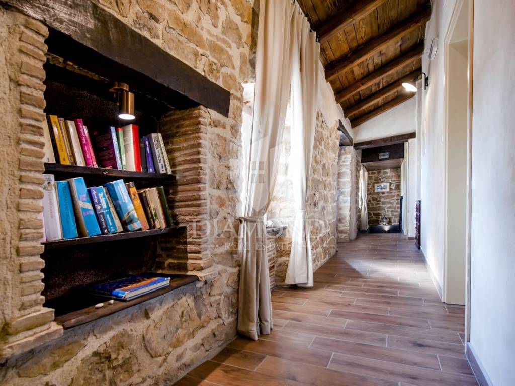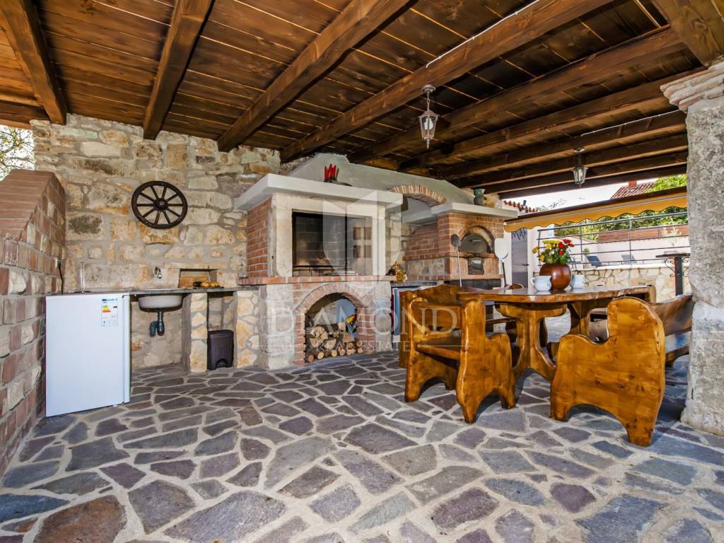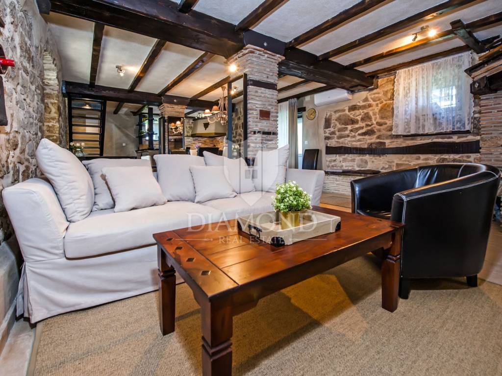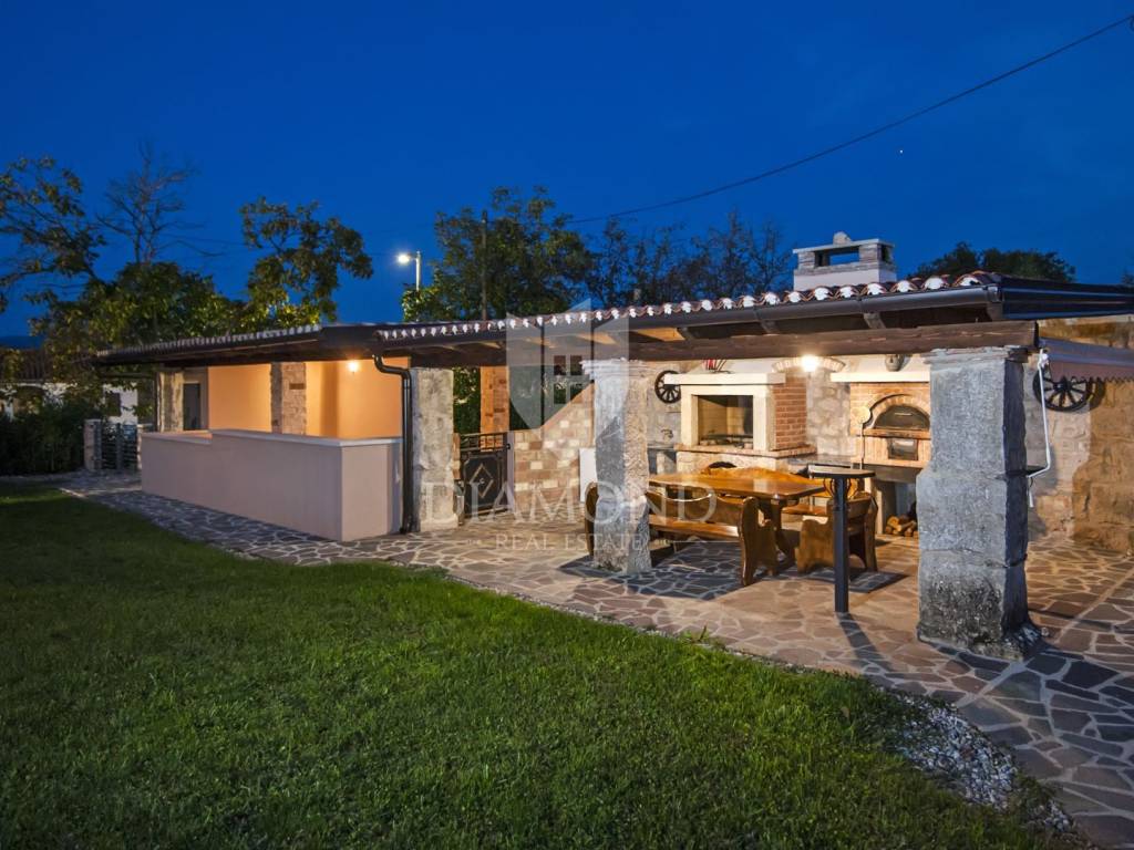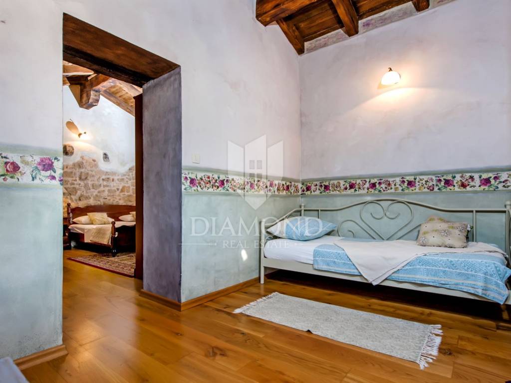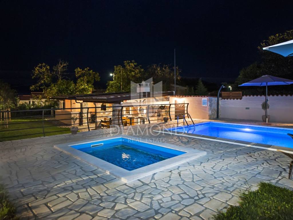 Kršan, surroundings, we are selling an autochthonous old villa which, with its design and a handful of contents, is breathtaking at first sight. The villa was built in 1926 and completely renovated in 2017. Both outside and inside, it is decorated with exceptional style and attention to detail that combines wood, stone and steel in a beautiful combination for a comfortable and functional life. The villa has a total area of 183 m2 of living space which extends to the ground floor and first floor. The ground floor consists of a comfortable living room, fully equipped kitchen and dining room. There is also a guest toilet and laundry. In the continuation of the ground floor, with a separate entrance, there is another bedroom with bathroom. Upstairs are three comfortable bedrooms, each with its own bathroom. The issue of heating and cooling is solved by a beautiful fireplace located in the living room, and air conditioners that are installed in all bedrooms. The interior design in all rooms perfectly complements the indigenous spirit of this beautiful property and creates the ideal atmosphere for a perfect vacation or luxurious family life. The garden is 2825 m2, fenced and has two accesses - one to the open parking for two cars and the other, covered parking with an automatic gate for two more cars. In addition to a handful of various facilities such as a beautiful summer kitchen with a bread oven and barbecue, two swimming pools - one larger than 54 m2 and one smaller, children's 9 m2, tennis court with auxiliary facility and beautiful terraces with beautiful views, concept the garden offers both privacy and peace. Also, the garden is beautifully landscaped and maintained with planted Mediterranean plants and an orchard with various fruit trees. A house that certainly stands out in the offer and has a well-established tourist rental business during the season, which the new owner has the opportunity to take over and continue. The location is well connected with the paved access road, 4 km away to the first shop, bakery, cafes, restaurants, schools, kindergartens and clinics, and 3 km to the medieval town of Pićan.