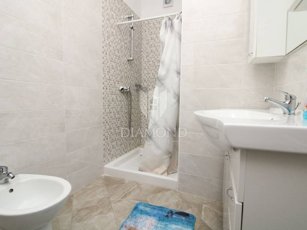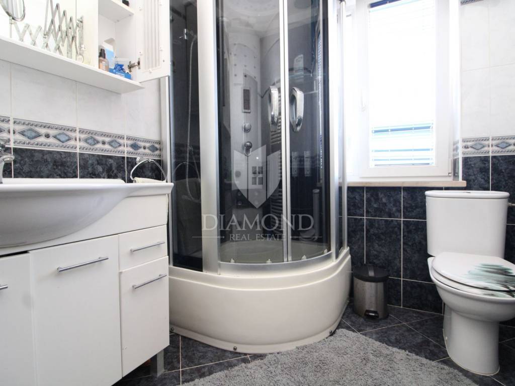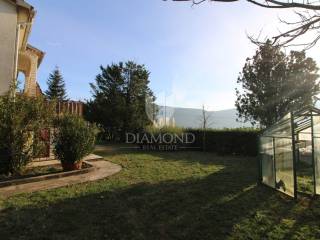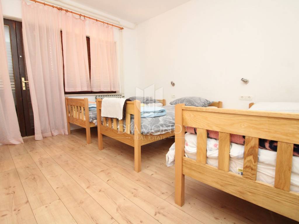 The house is designed as a two-story building with two separate residential units divided into a ground floor and a first floor. The apartment on the ground floor has a total area of 119.10 m2 and consists of three bedrooms, two bathrooms and a living room with dining room and kitchen. The living room is connected to an outdoor terrace with access to the garden and garden. The apartment on the first floor consists of a spacious living area that combines a living room, a dining room and a fully equipped kitchen, three bedrooms, a storage room and a bathroom. It has a total area of 142.85 m2 with a large sunny terrace with a beautiful view of the surrounding landscape and nature. The house has wood-fired central heating and the apartments are air-conditioned. The house also has a garage and an auxiliary building next to the house.