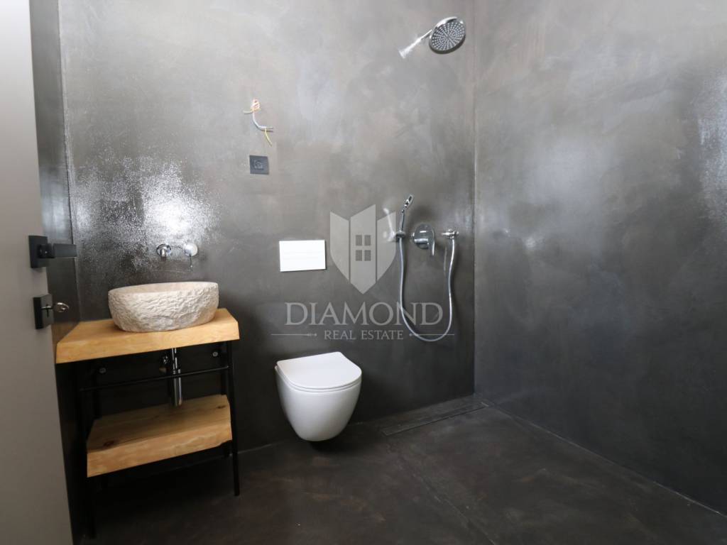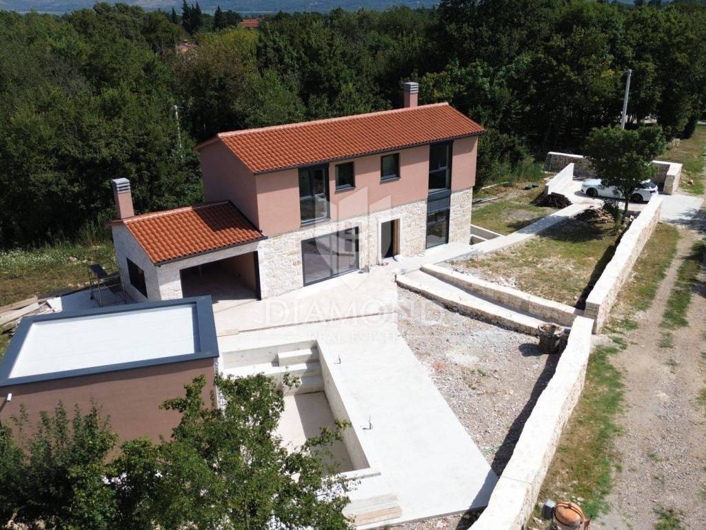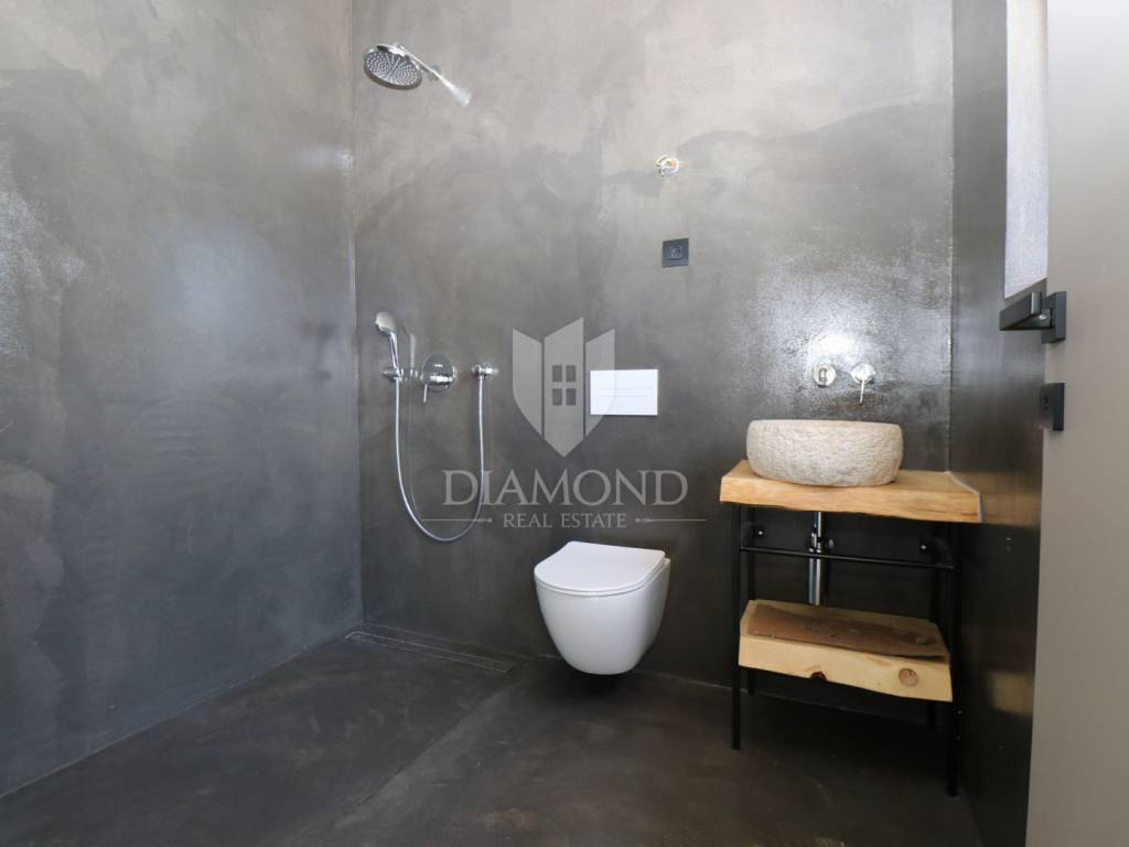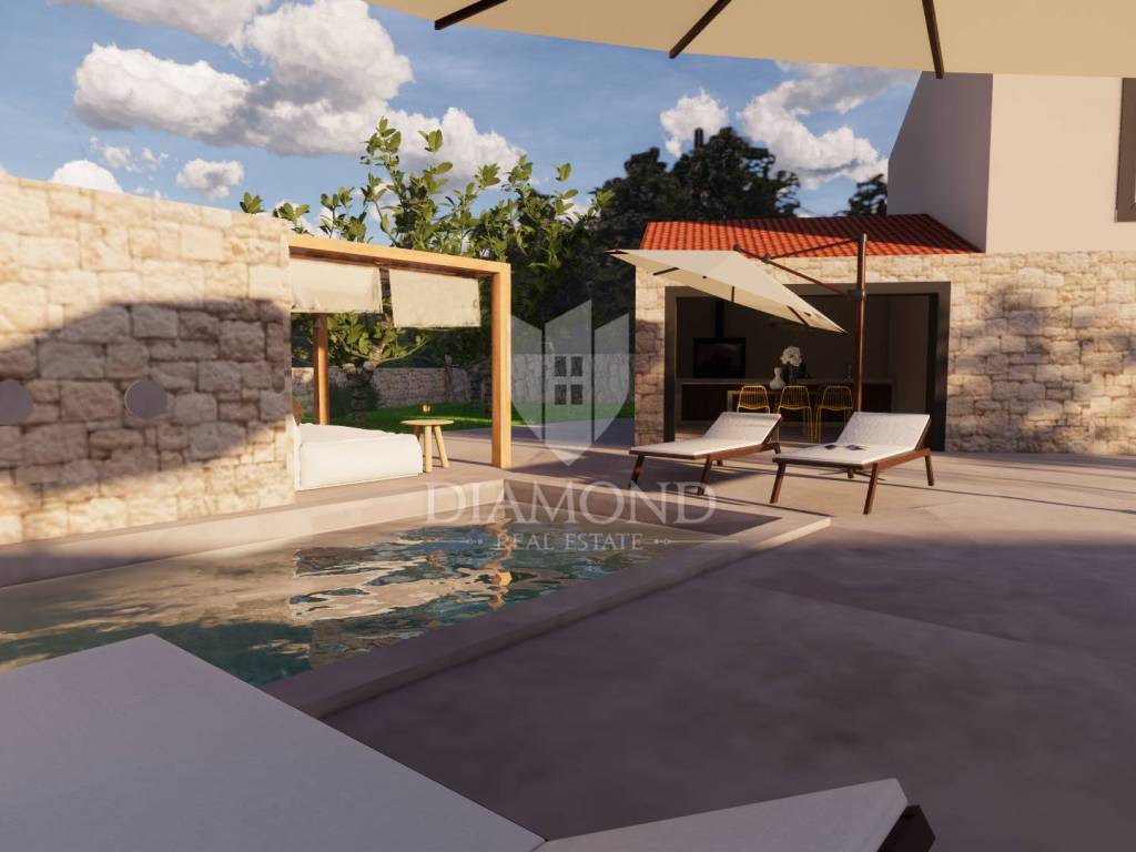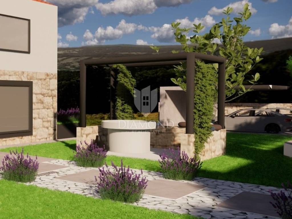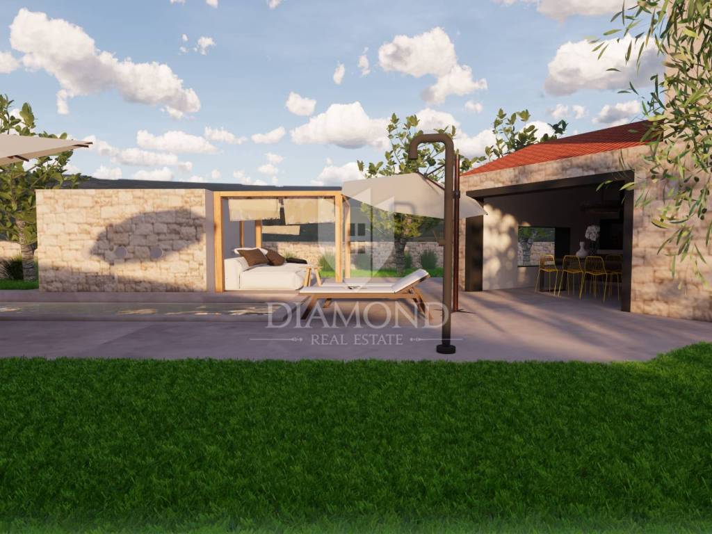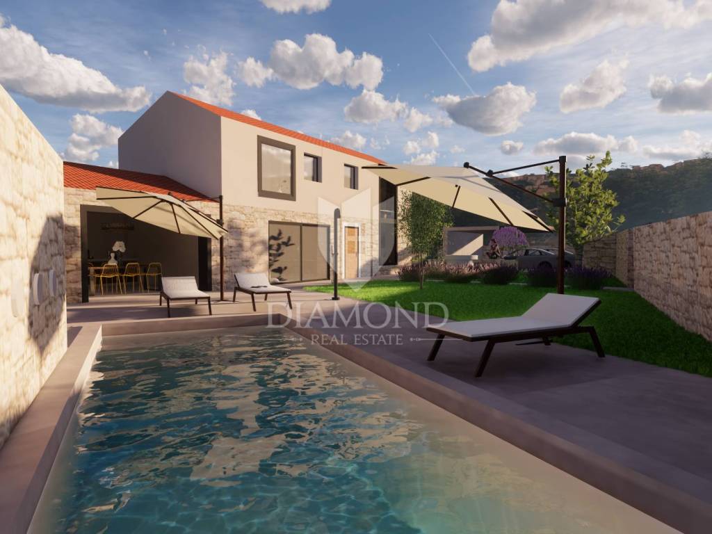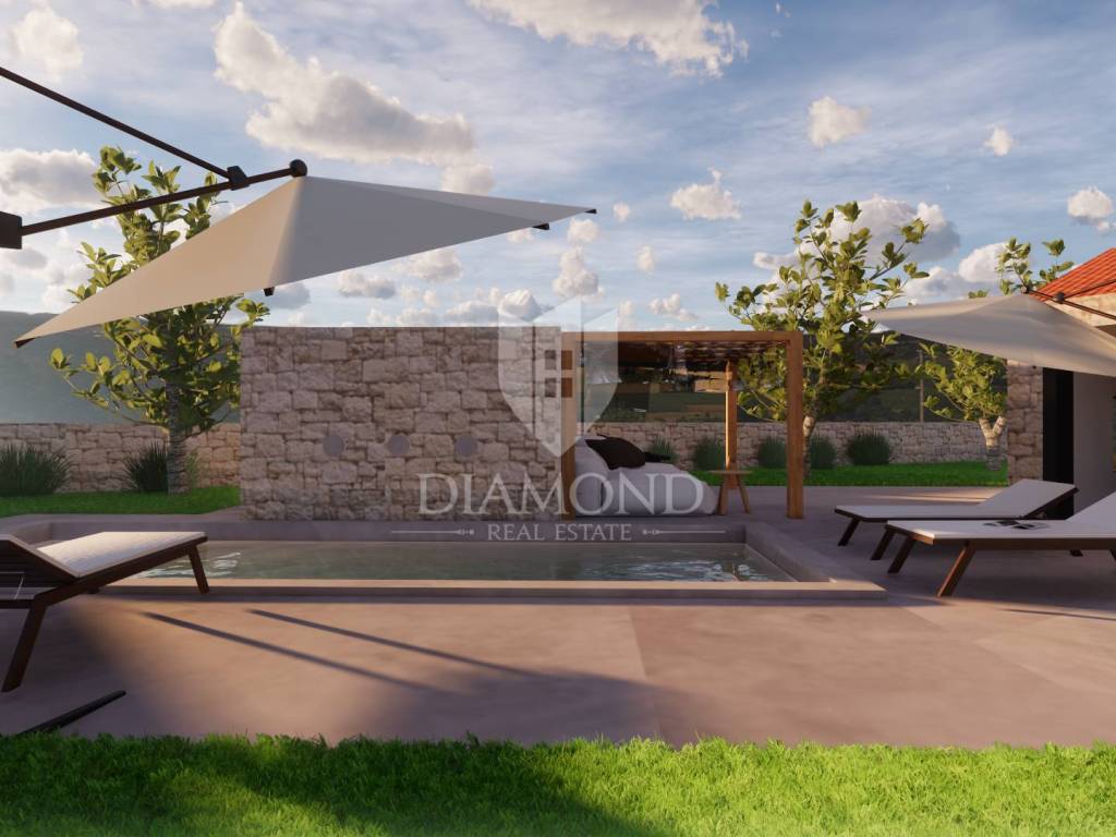 Labin, surroundings, new stone construction with a modern look Here is an opportunity to own an incredible Istrian stone house, renovated and upgraded with love and attention by a renowned architectural studio. This unique property shines with a combination of traditional Istrian charm and modern design. It is located in a quiet location near Labin, providing the perfect place to relax and enjoy privacy. This villa offers a comfortable and luxurious living space, with a spacious open space area that includes a kitchen, dining room and living room. On the first floor there are two spacious bedrooms, each with its own bathroom, providing comfort and intimacy. A special addition is the frameless sliding rocks that open the space to the outside, creating a feeling of connection with nature. The villa also comes with an outdoor summer kitchen, perfect for socializing and having fun outdoors, as well as a sauna area and a wonderful pool, ideal for refreshment and relaxation. All this is located on a spacious plot of 1295 m2 with a beautiful Istrian barn as an additional artistic detail. Do not miss the opportunity to become the owner of this beautiful Istrian stone villa. Contact us today to find out more and arrange a viewing.