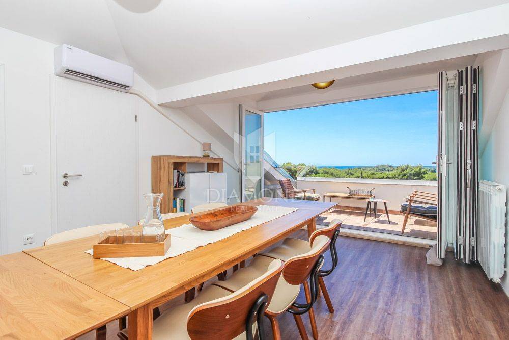 We present to you this excellent luxury apartment in a sought-after Pula settlement. It is located only 200 meters from the beach, and surrounded by all amenities for life and vacation.