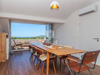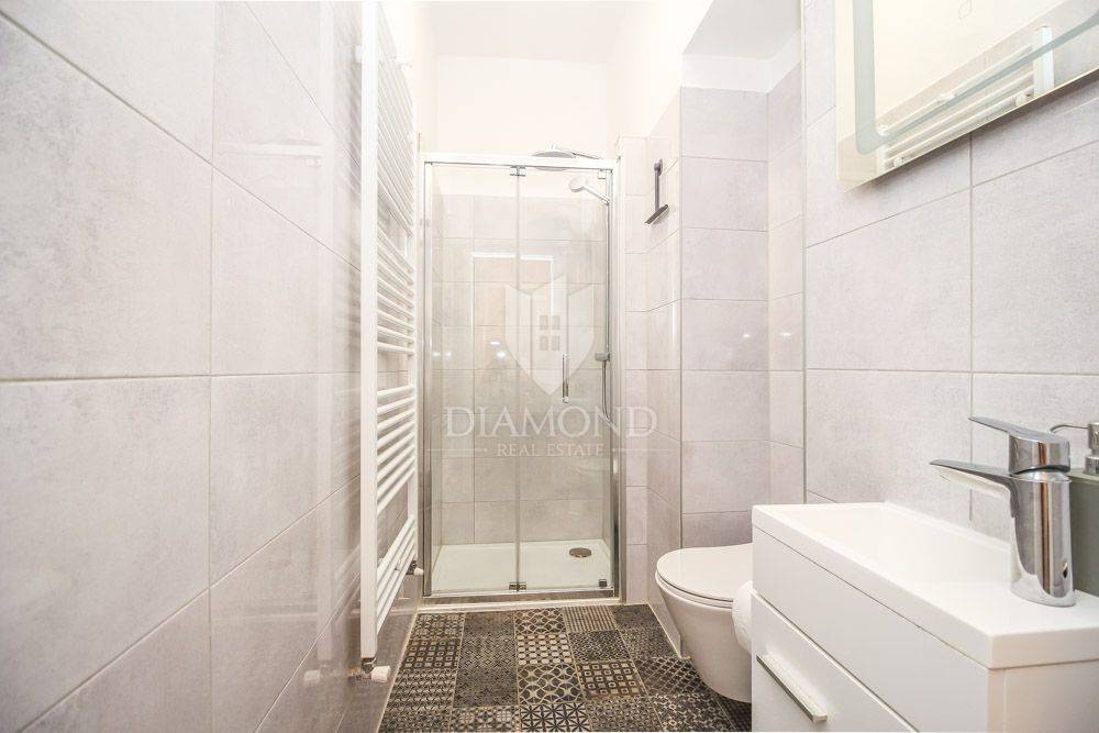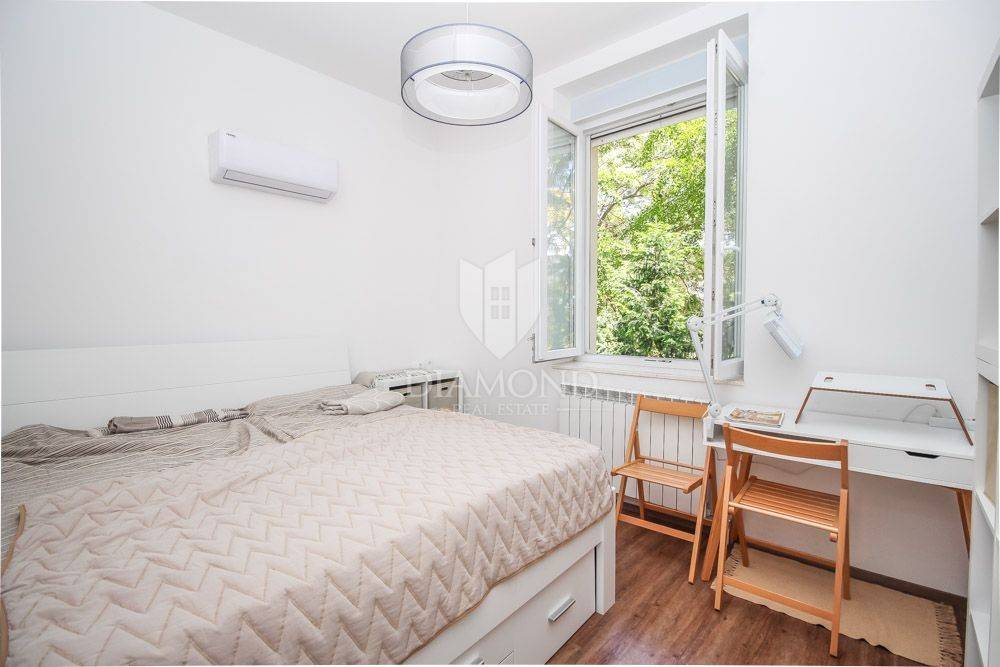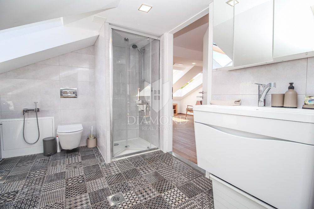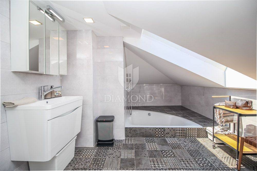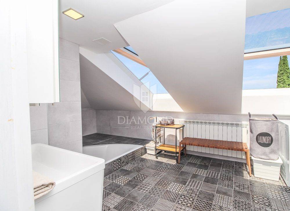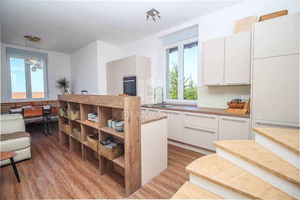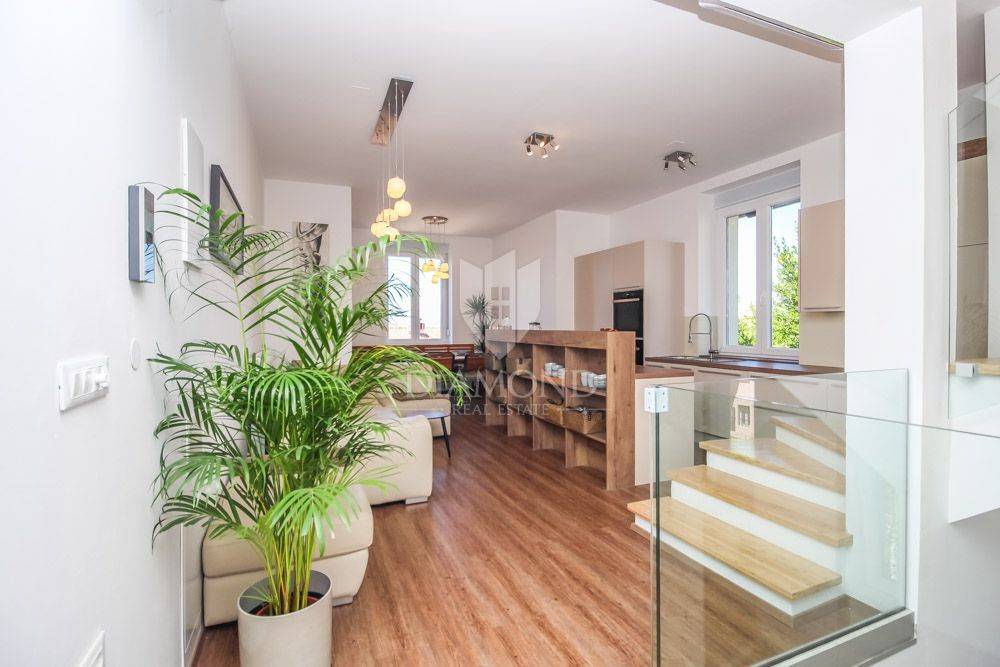 The apartment is located in a beautiful Austro-Hungarian villa, it has an area of 130 m2 and extends through 3 floors that are interconnected by an elevator. It consists of an open space with a kitchen, dining room and living room, three bedrooms, two bathrooms, and on the last floor in the attic there is a real small area for resting and enjoying the panoramic view of the sea. Part of the garden belongs to the apartment, so you also get a potential place for a barbecue or a garden and the like.