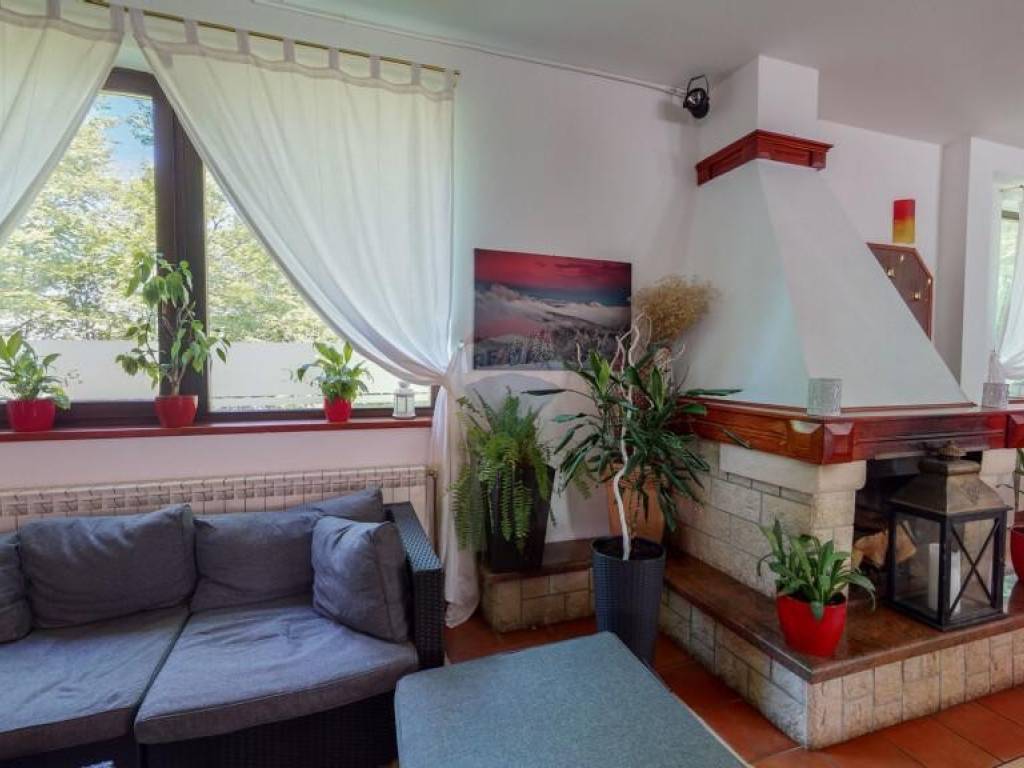 Na gornjoj etaži, koja ima zaseban vanjski ulaz nalaze se 4 prostrane sobe, višekrevetne, svaka sa vlastitom kupaonicom, te jedna od soba ima izlaz prostranu terasu sa predivnim otvorenim pogledom na grad Delnice i okolne planine.