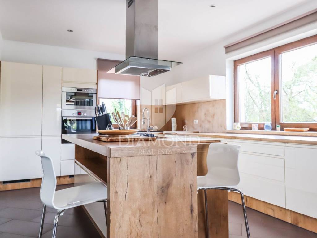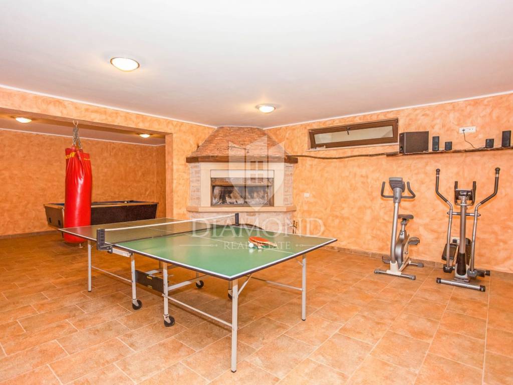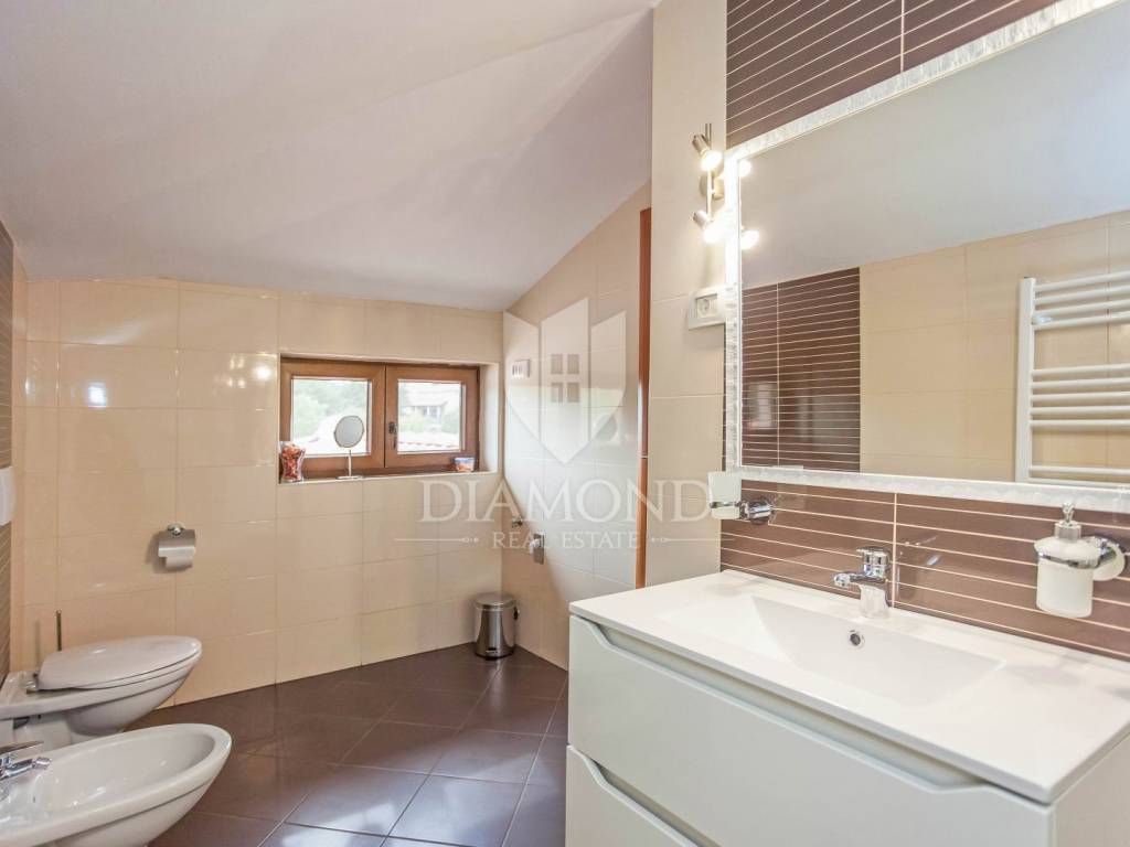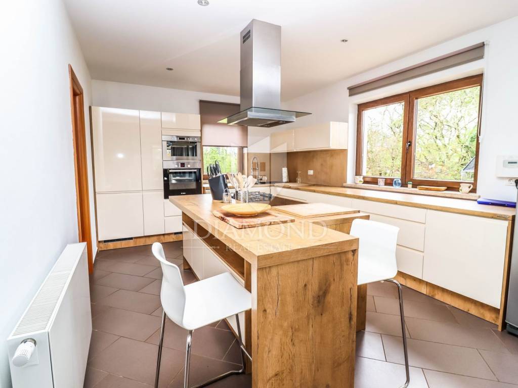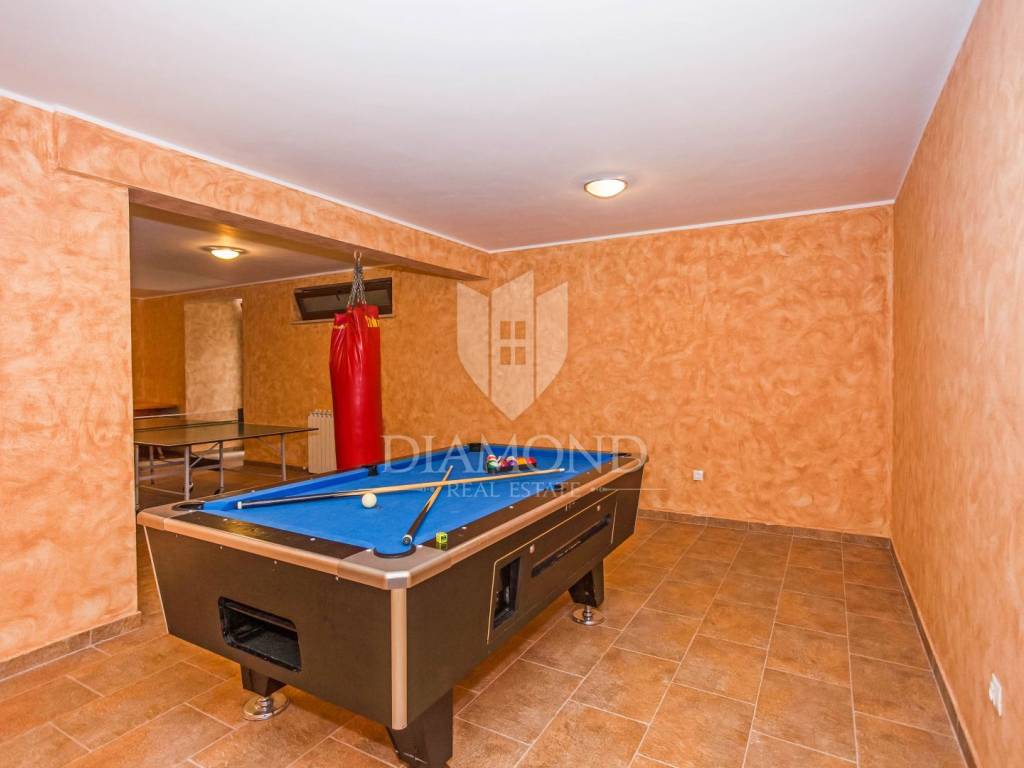 The house is located on a plot of 2500m2, which guarantees peace, and the house itself has 400m2 of living space divided into two floors and a basement. The ground floor has a living room that is in an open concept connected to the dining room and kitchen and pantry, one bedroom and bathroom. From each room in the living area there is a view of the pool and the beautiful garden. Upstairs, which is designed as a high attic, there are bedrooms with private bathrooms. Each room has its own air conditioning. The rooms are modernly decorated, with high quality furniture, appliances and toilets. In the basement there is a multipurpose room with a fireplace that is handmade in stone. Also, there is a laundry room and another small toilet. The yard and yard are arranged, the size of the plots was used to the maximum to make the greenery pleasing to the eye and to maintain privacy. The garage is located in the basement and can accommodate two vehicles.