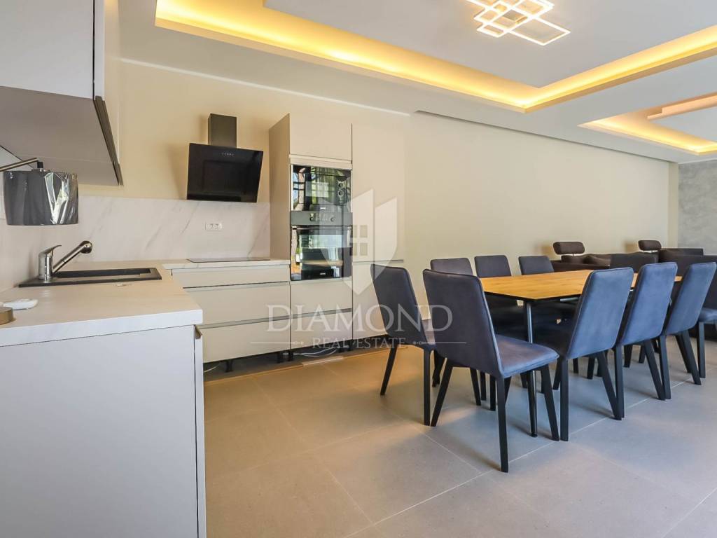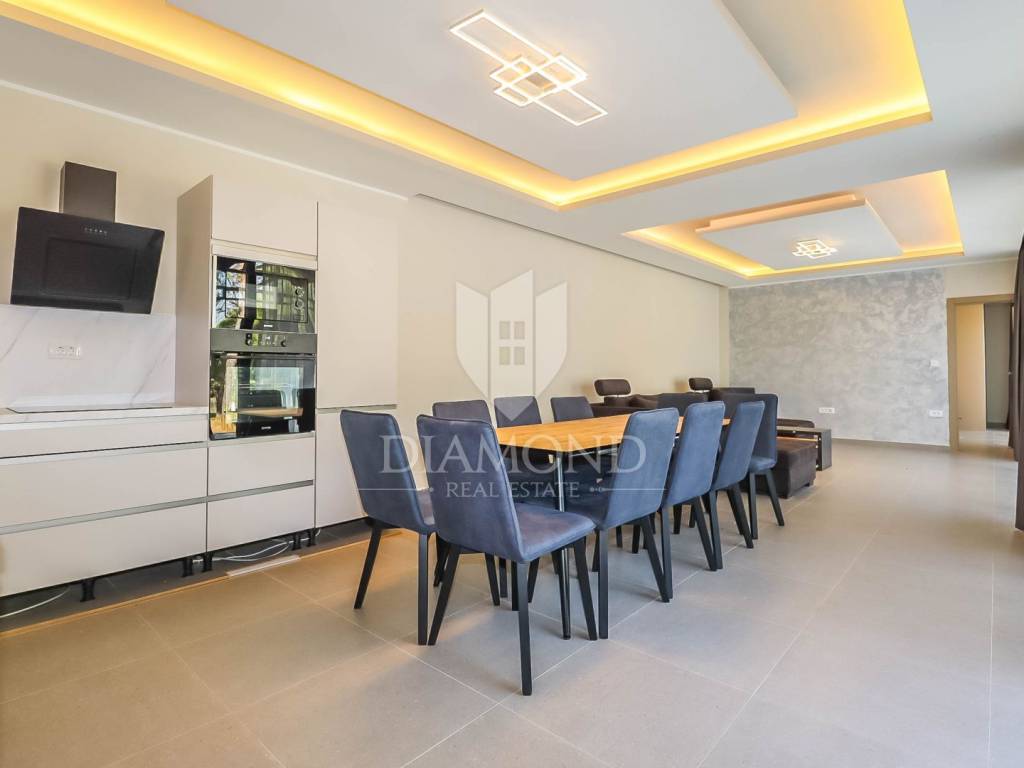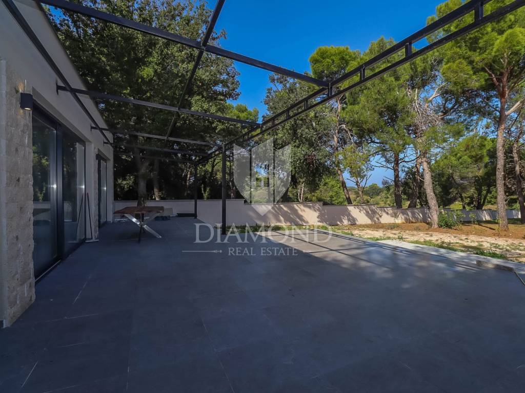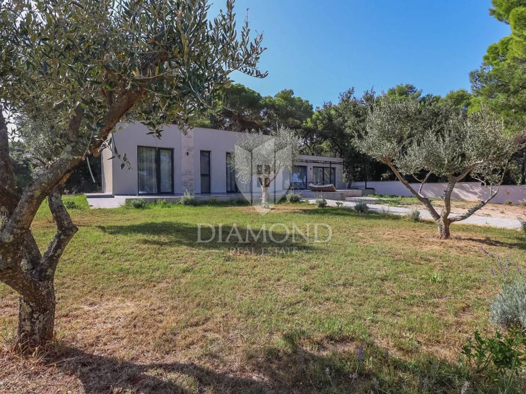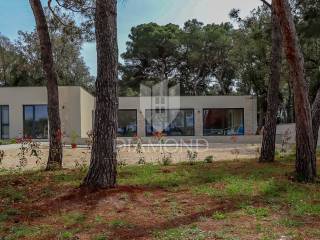 This villa consists of a spacious living room, which is connected to the kitchen and dining room, from which a large glass wall leads to a large uncovered terrace. The rest of its area of 155m2 is also occupied by four bedrooms with their own bathrooms and one guest toilet. The large garden of 2300 m2 allows you to enjoy the fresh air and the possibility of various outdoor activities, while at the same time providing parking for several cars.