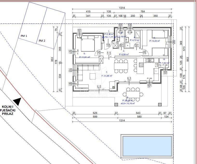 Upon entering the house, the hallway leads to the first section—on the right is a spacious bedroom, while on the left, another hallway leads to a second bedroom, a bathroom, and a guest toilet. Opposite the entrance, the central part of the home opens up—a bright and airy living room seamlessly connected to the kitchen and dining area. Large glass walls allow an abundance of natural light and provide access to a covered terrace, which extends towards the sunbathing area and swimming pool, creating the perfect space for relaxation and socializing.